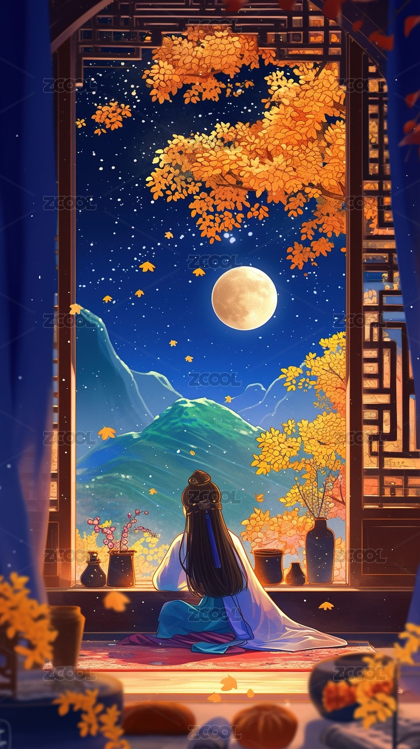 中秋节赏月美女插画