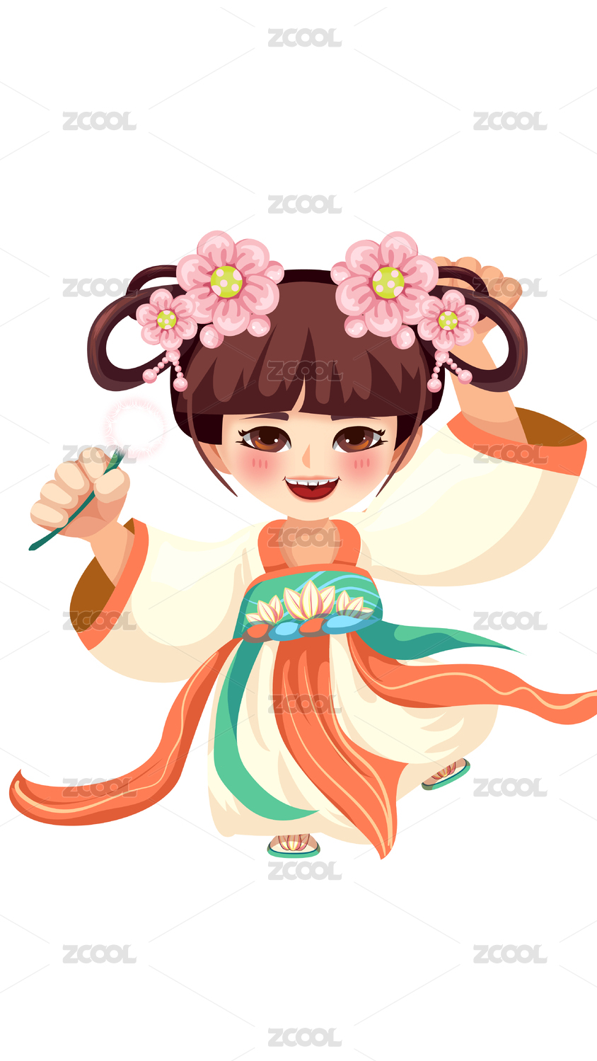 紫色橙色系古代裙子盘发仕女矢量插画古代