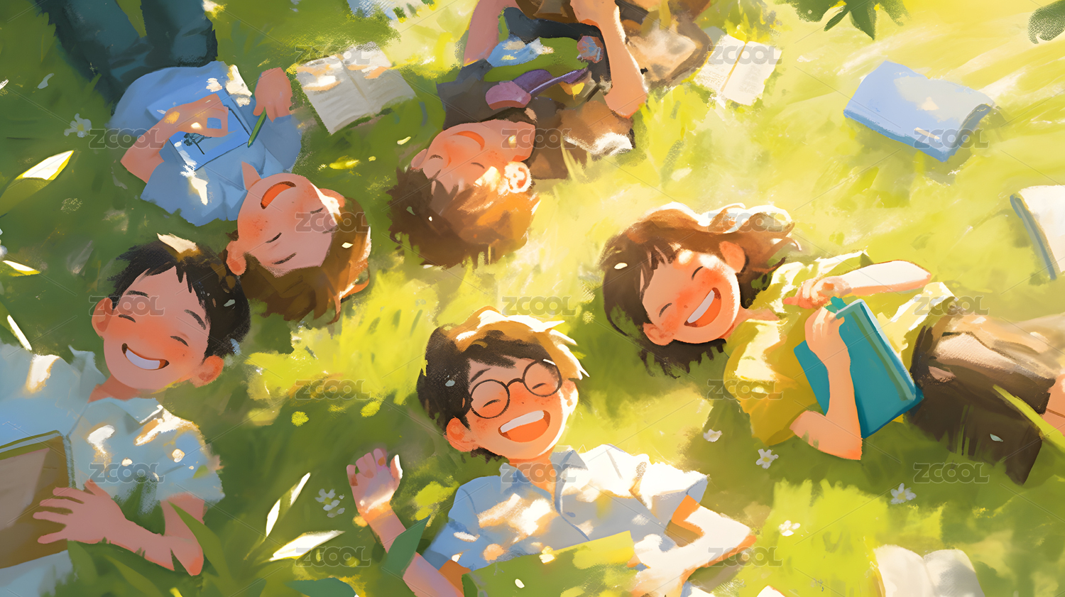 草地上躺着的学生和书本插画