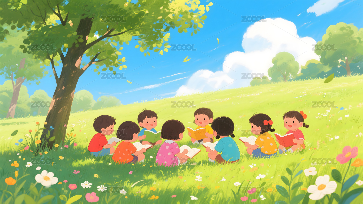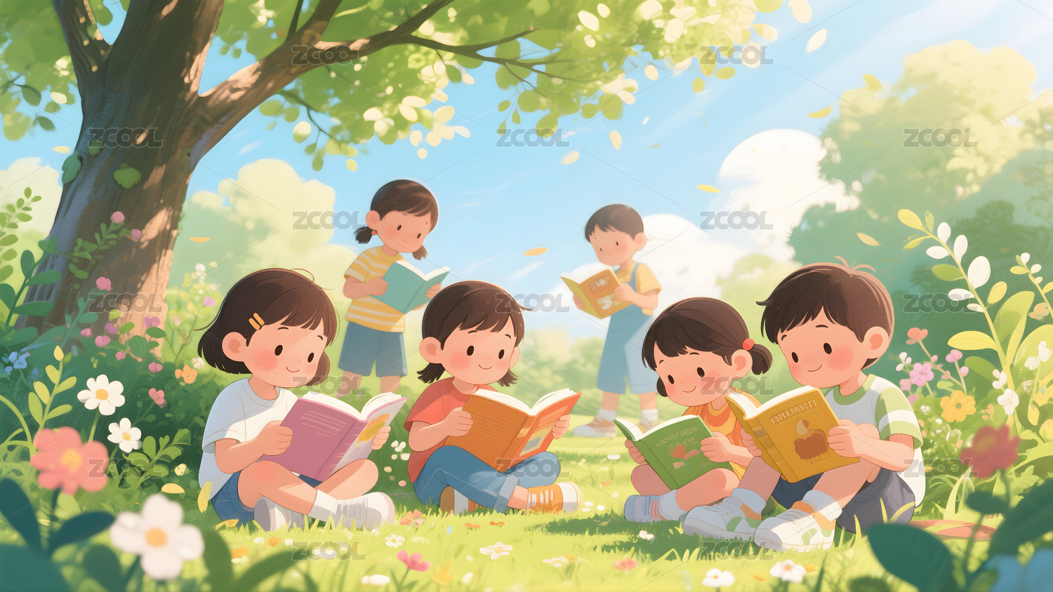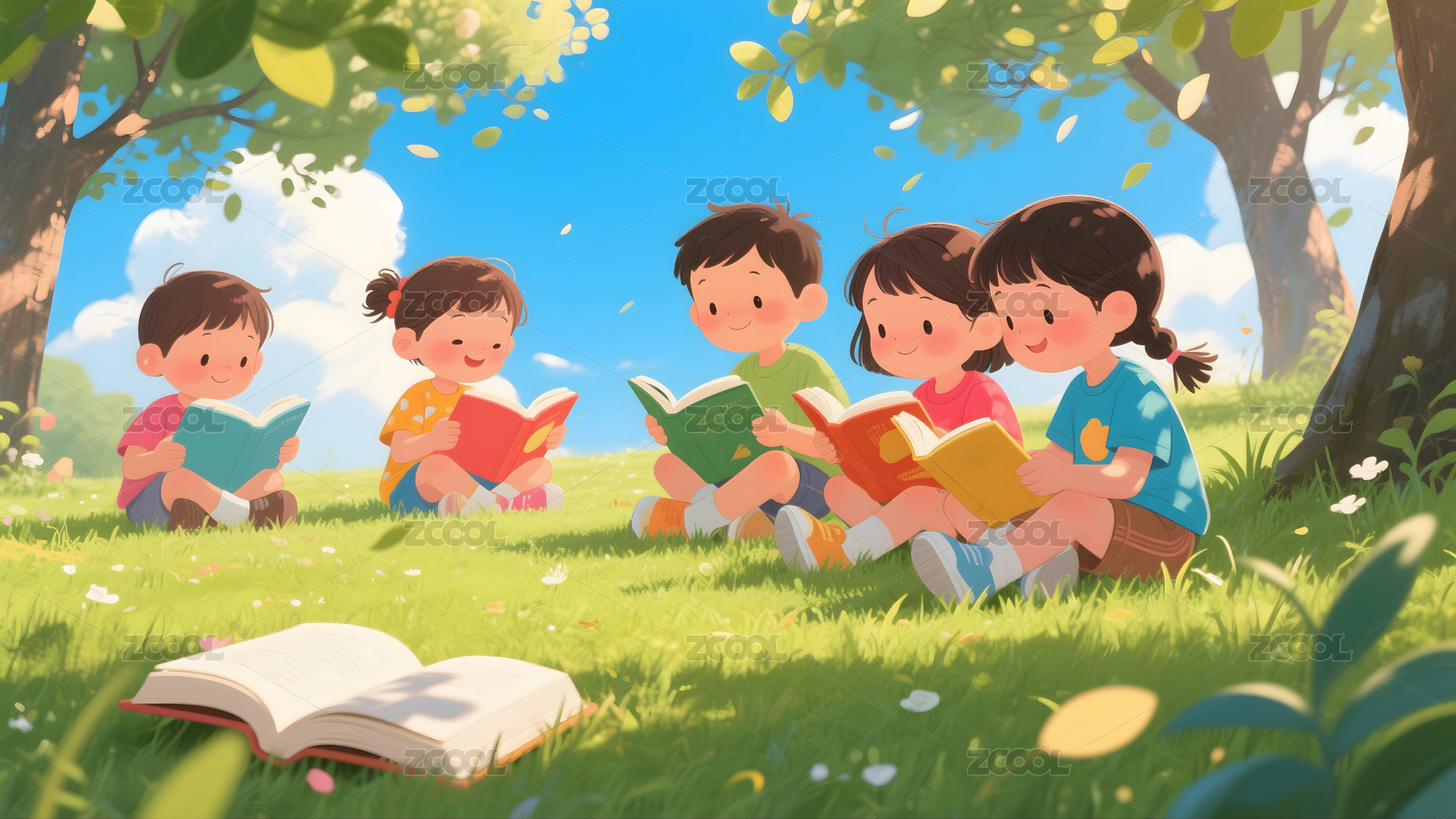 孩子们在阳光下读书玩耍