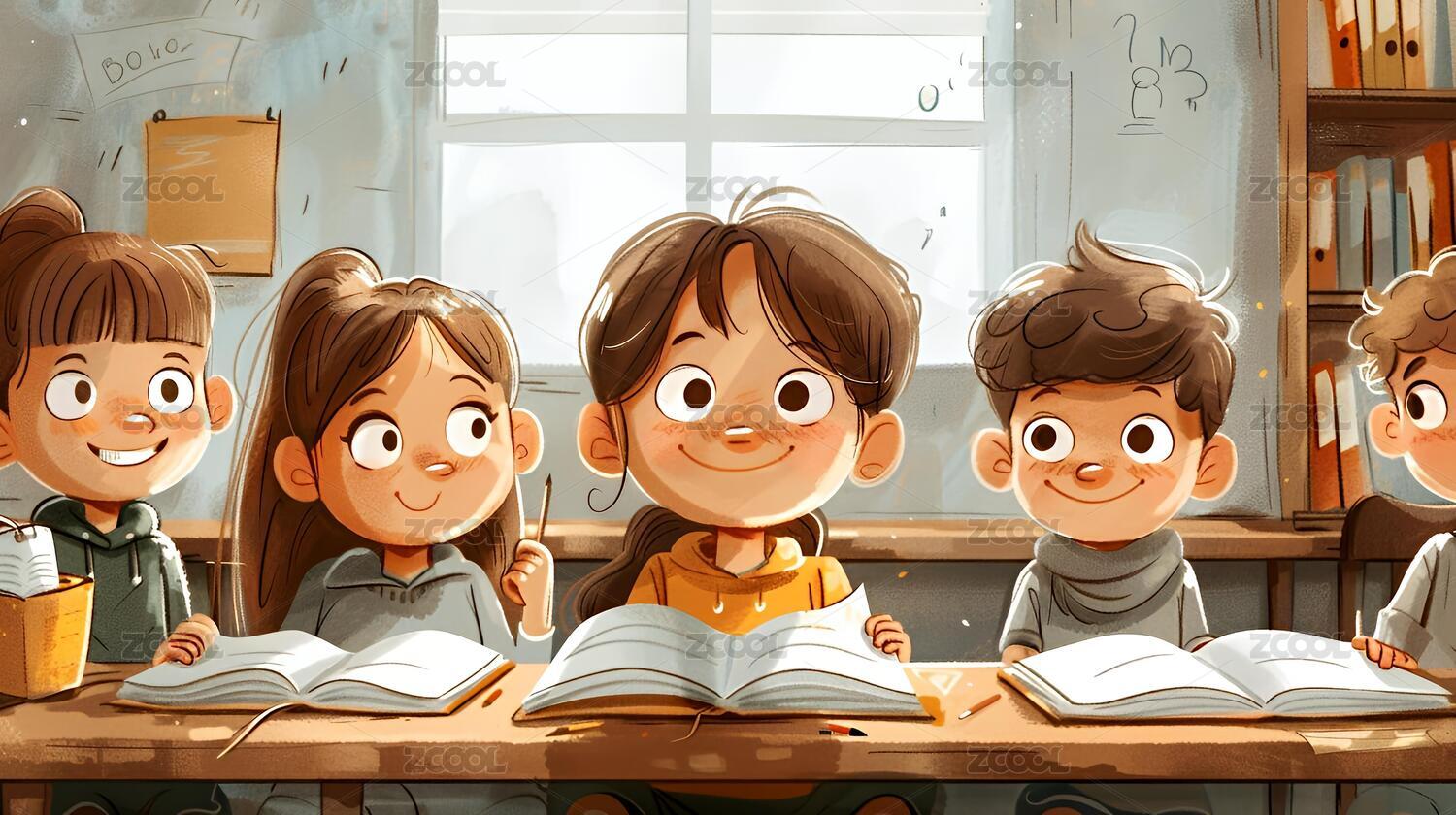 教室里学生一起学习手绘插画