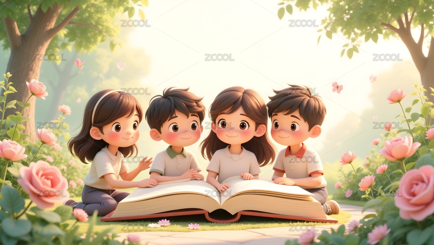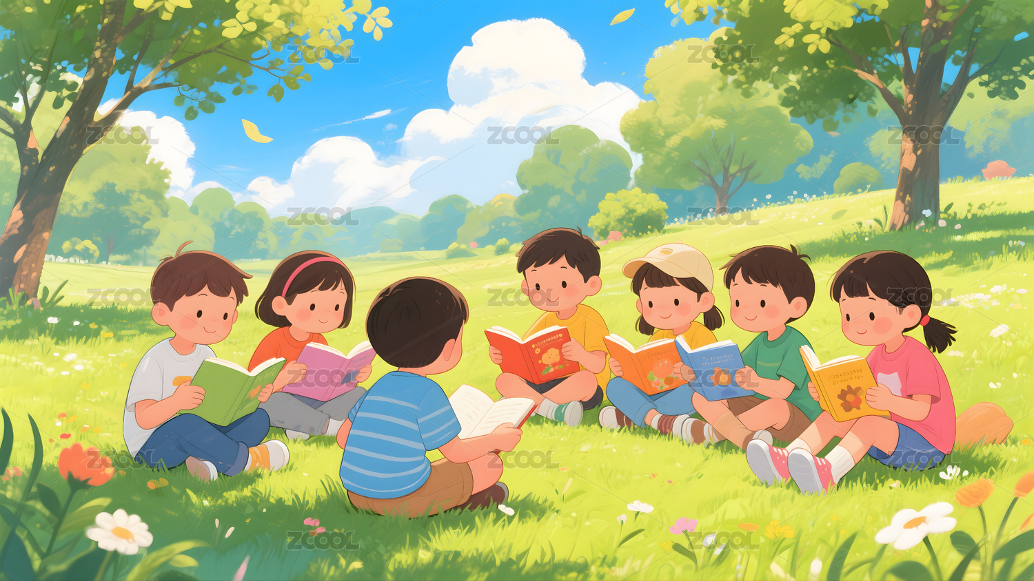 孩子们在花园里阅读