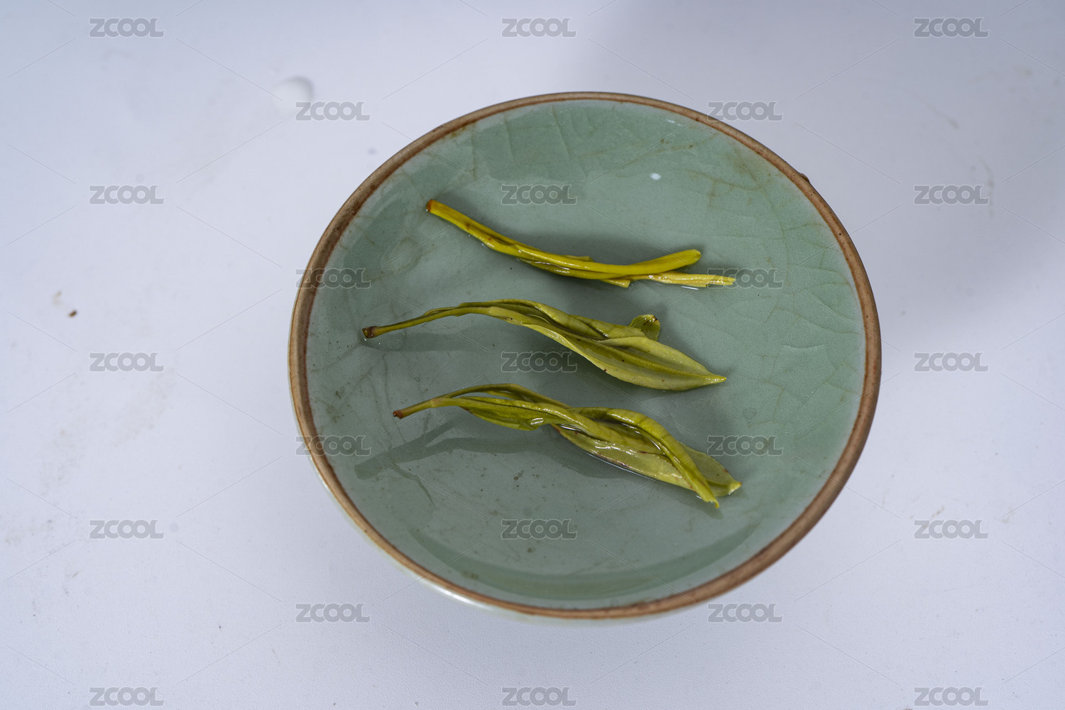 瓷小盘上面放着嫩绿色西湖龙井叶底