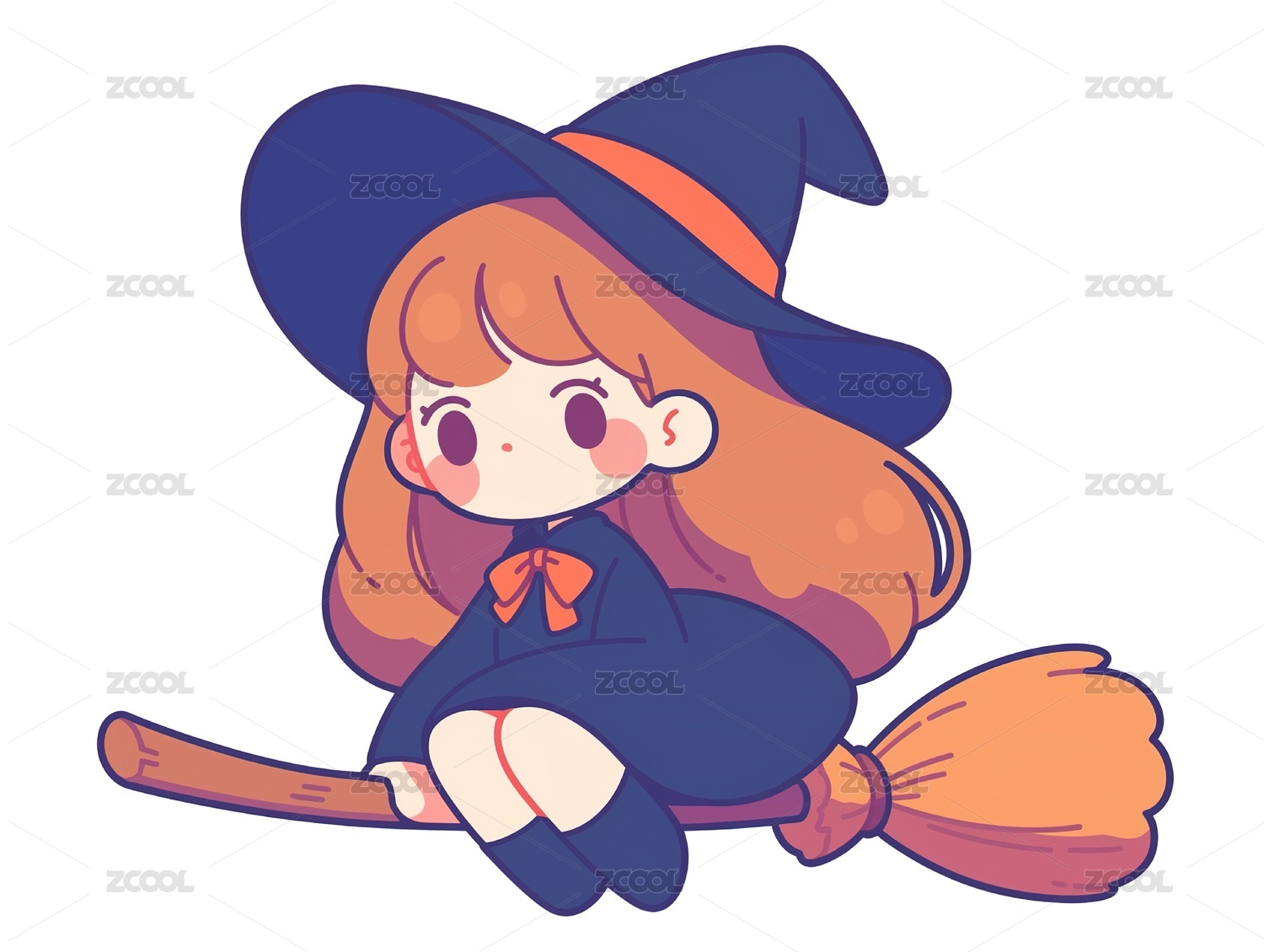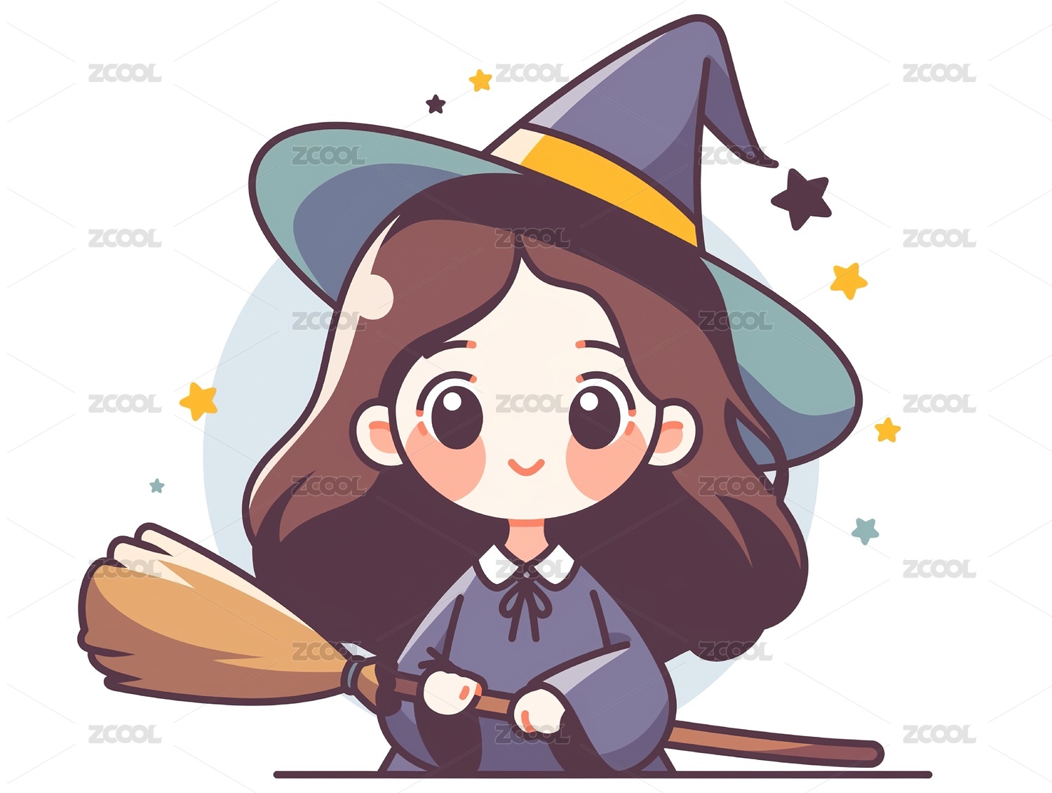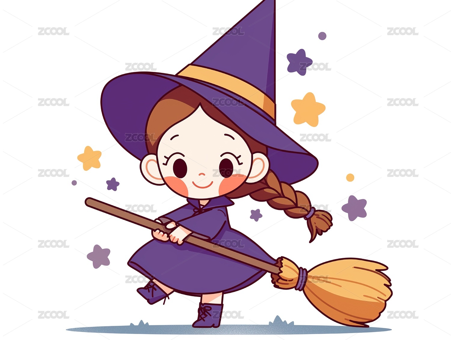 紫黄卡通万圣节小女巫骑着扫帚