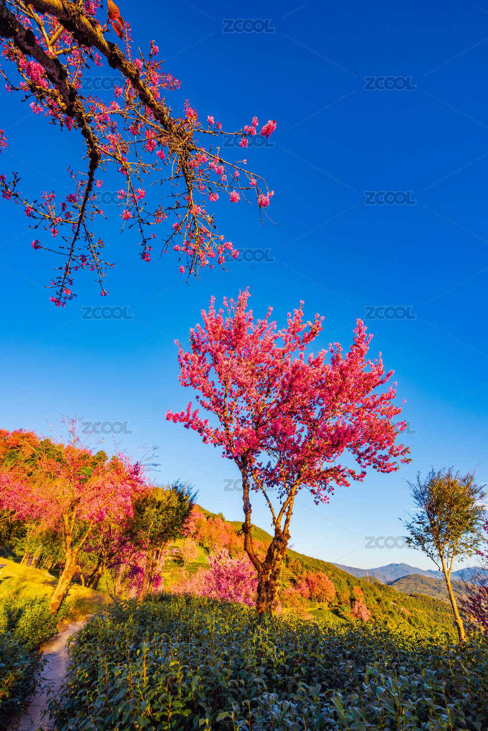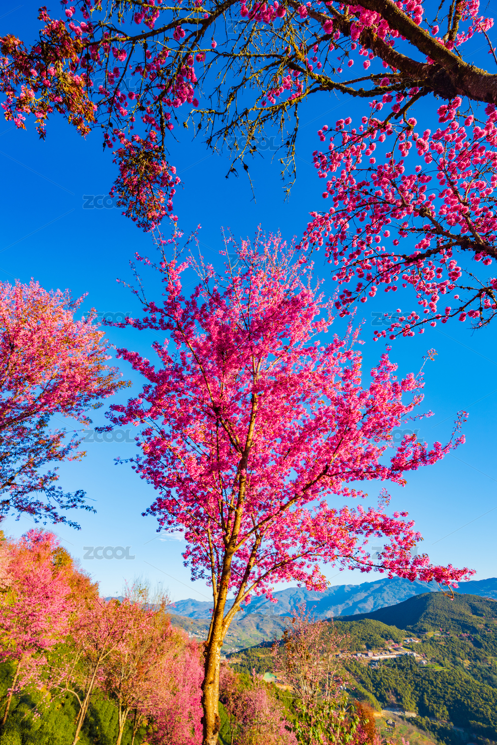 仰拍蓝天下盛开的粉色樱花,中国福建永福