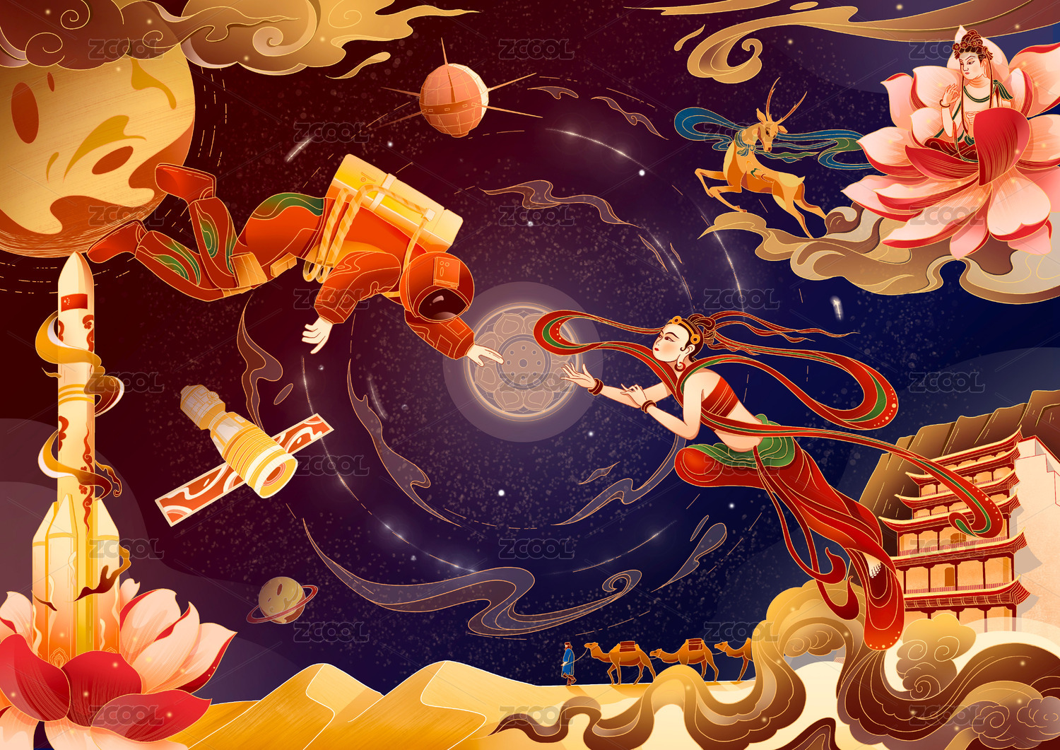 唐朝敦煌宫殿祥云牡丹奏乐舞蹈飞天伎乐藻井花纹插画