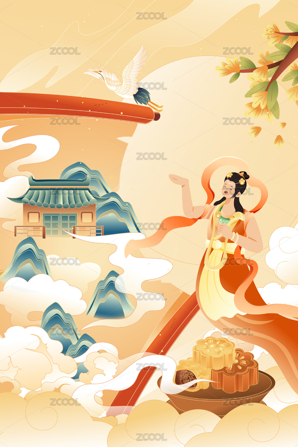 河边怀抱乐器的唐朝美女和锦鲤国风插画