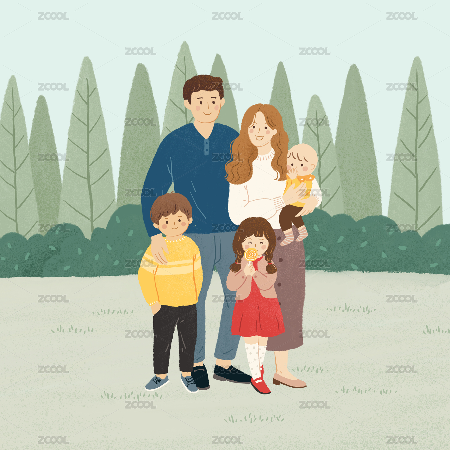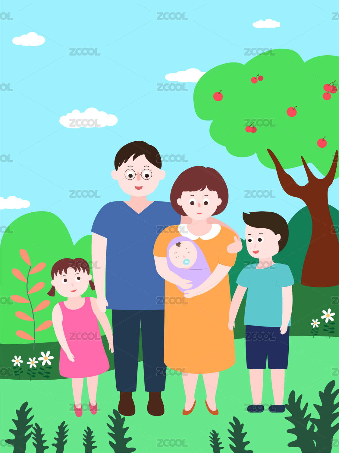 绿色,绘本,蓝色,黄色,绿草地,星空,全家福,插画
