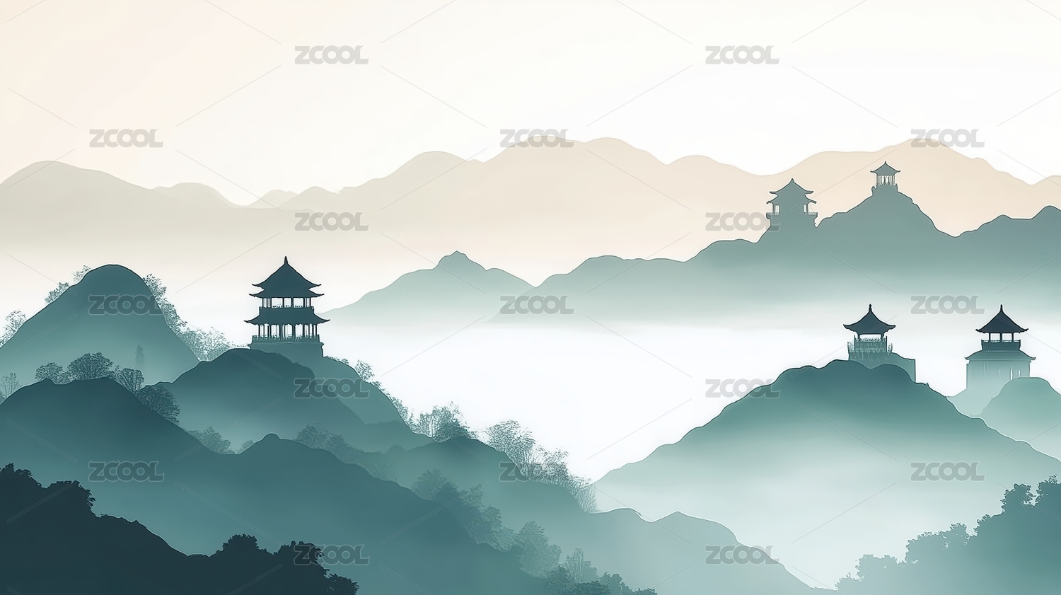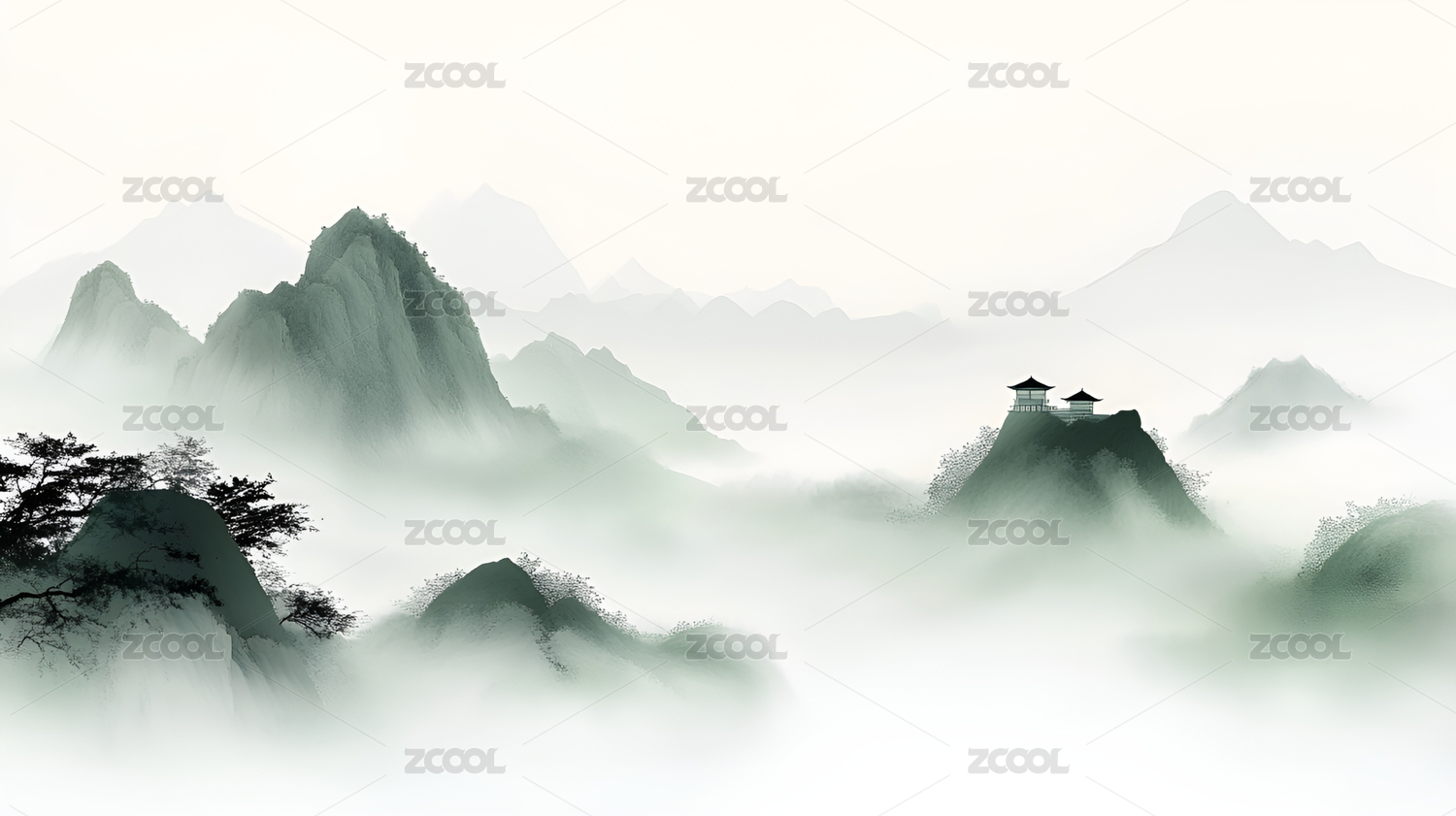 国风水墨画山脉亭台