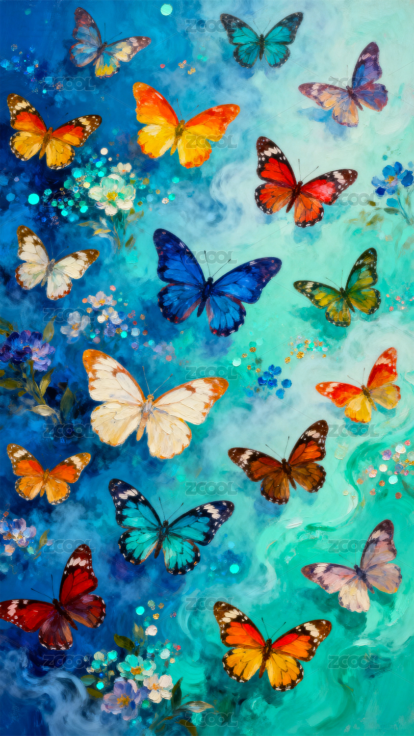 五彩斑斓蝴蝶于梦幻蓝绿背景飞舞