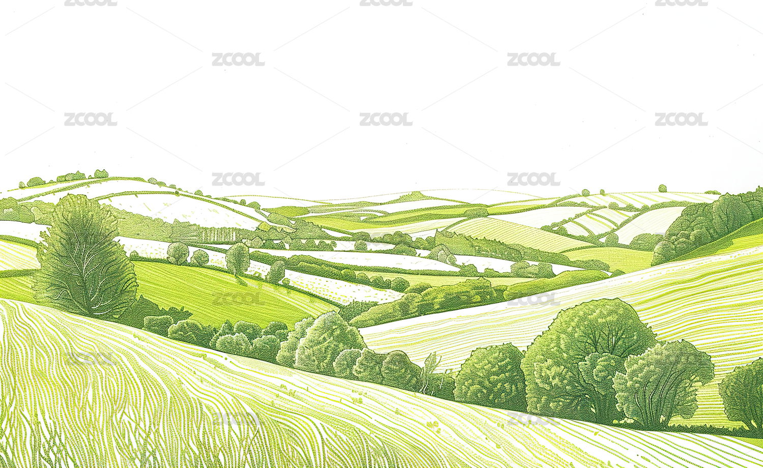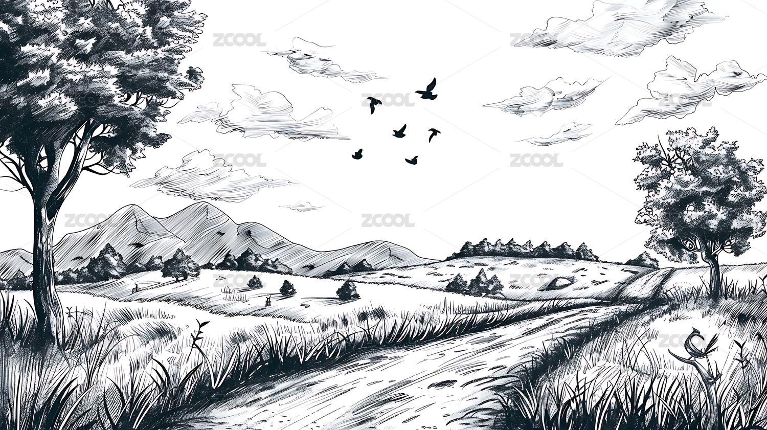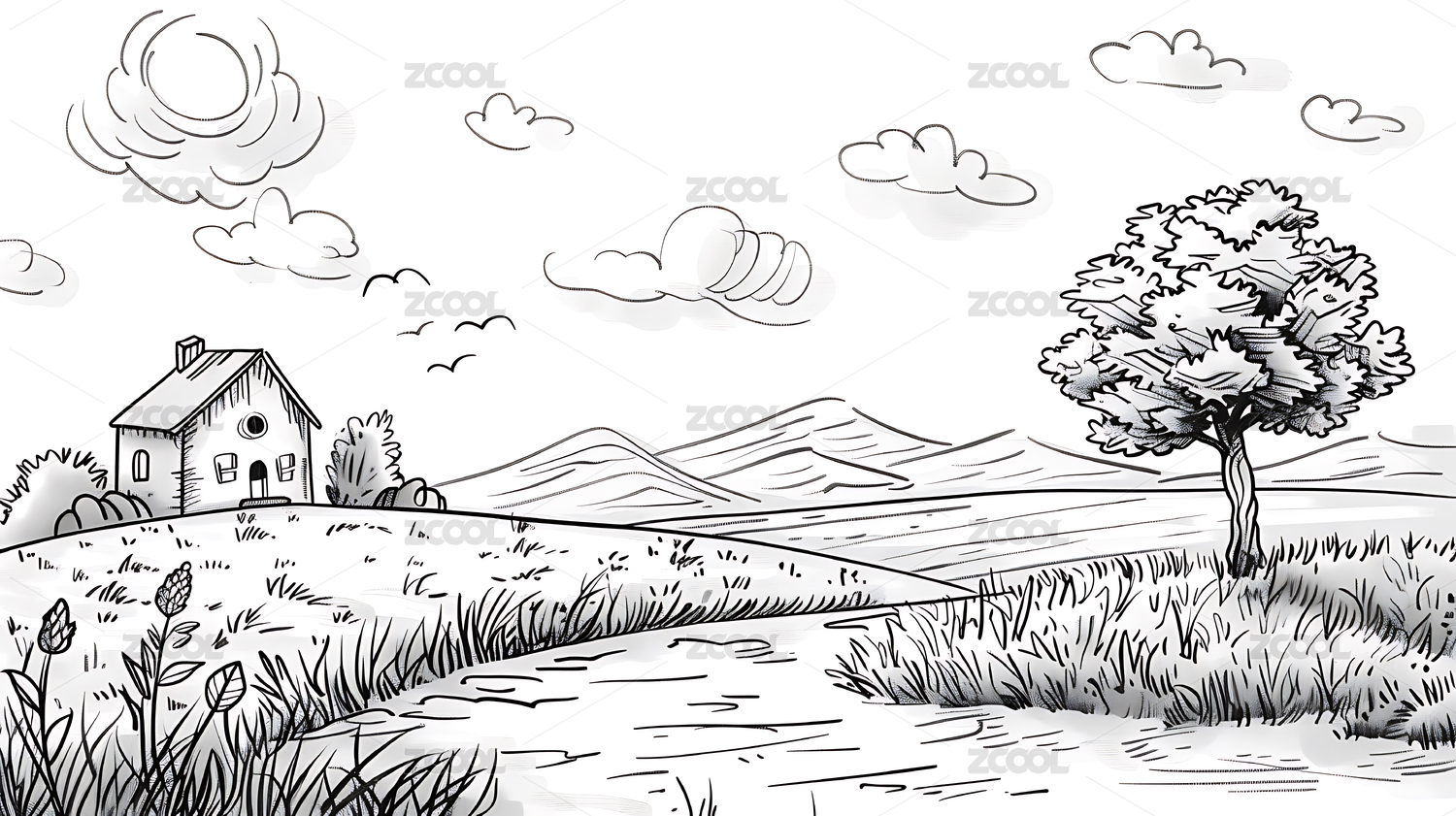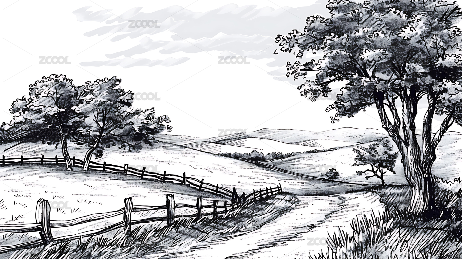素描,乡村,树木,田野,草地,天空,云朵,远景,近景,构图