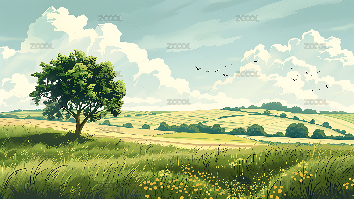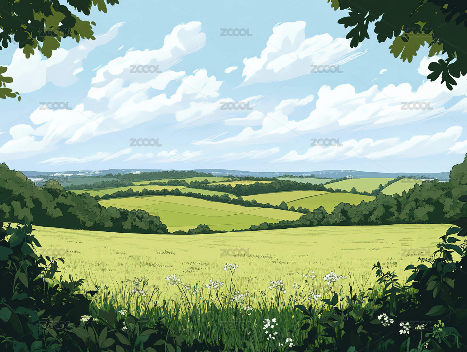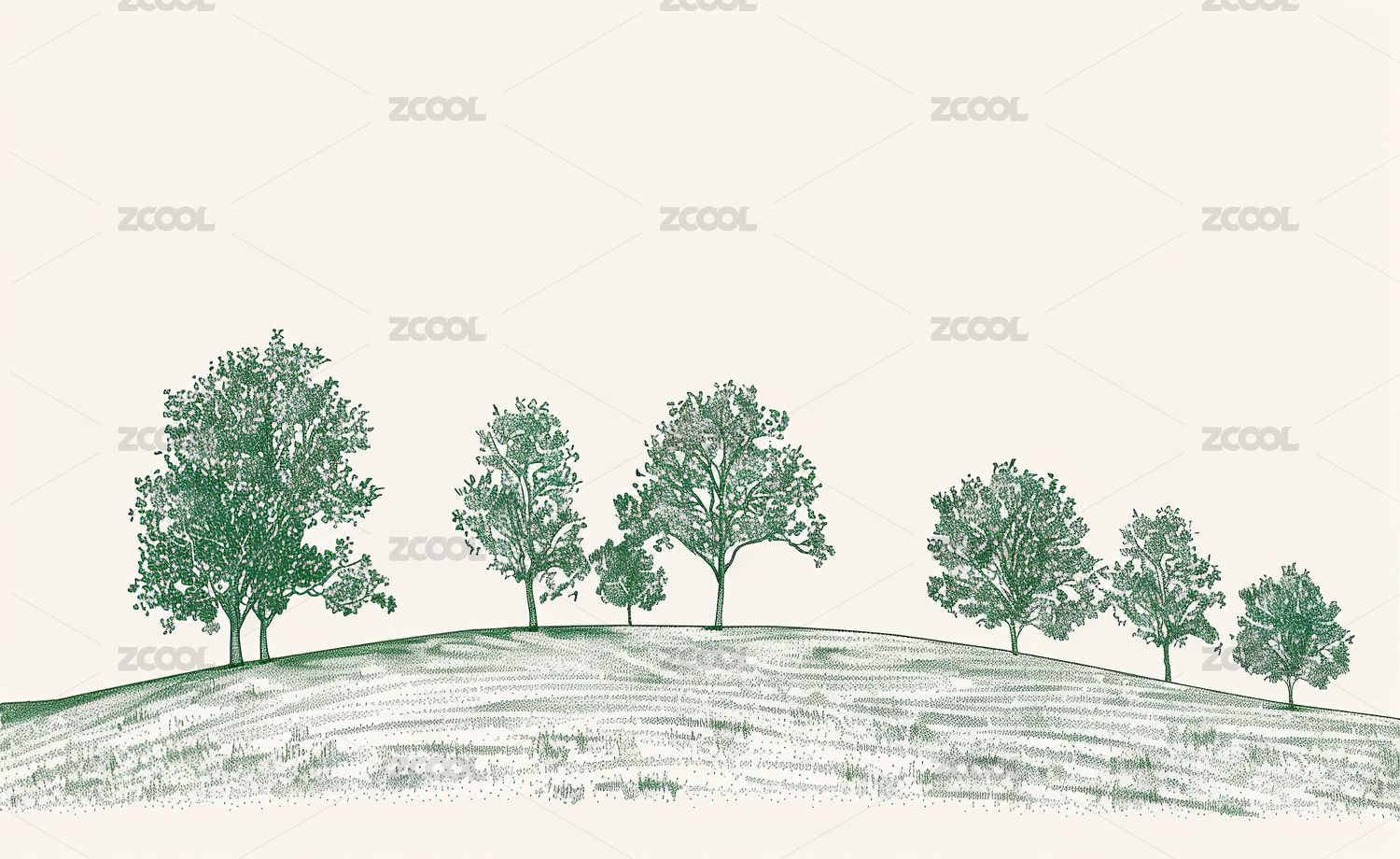 素描,乡村,树木,田野,草地,天空,云朵,远景,近景,构图