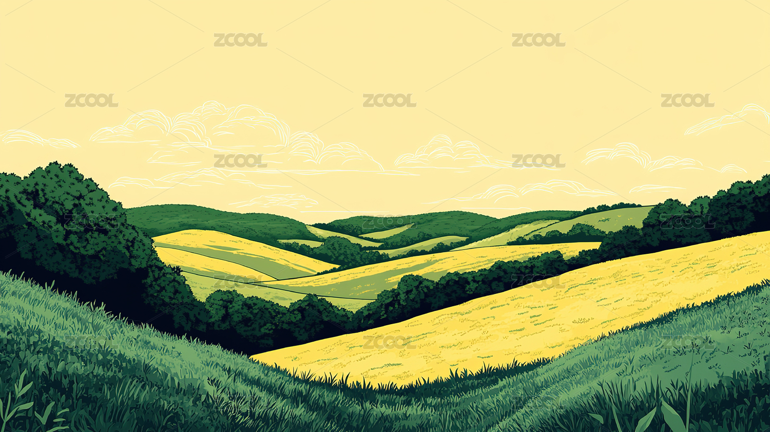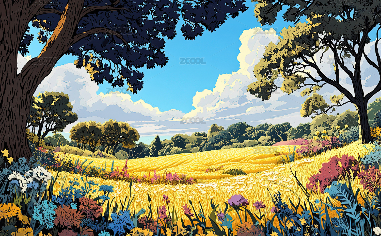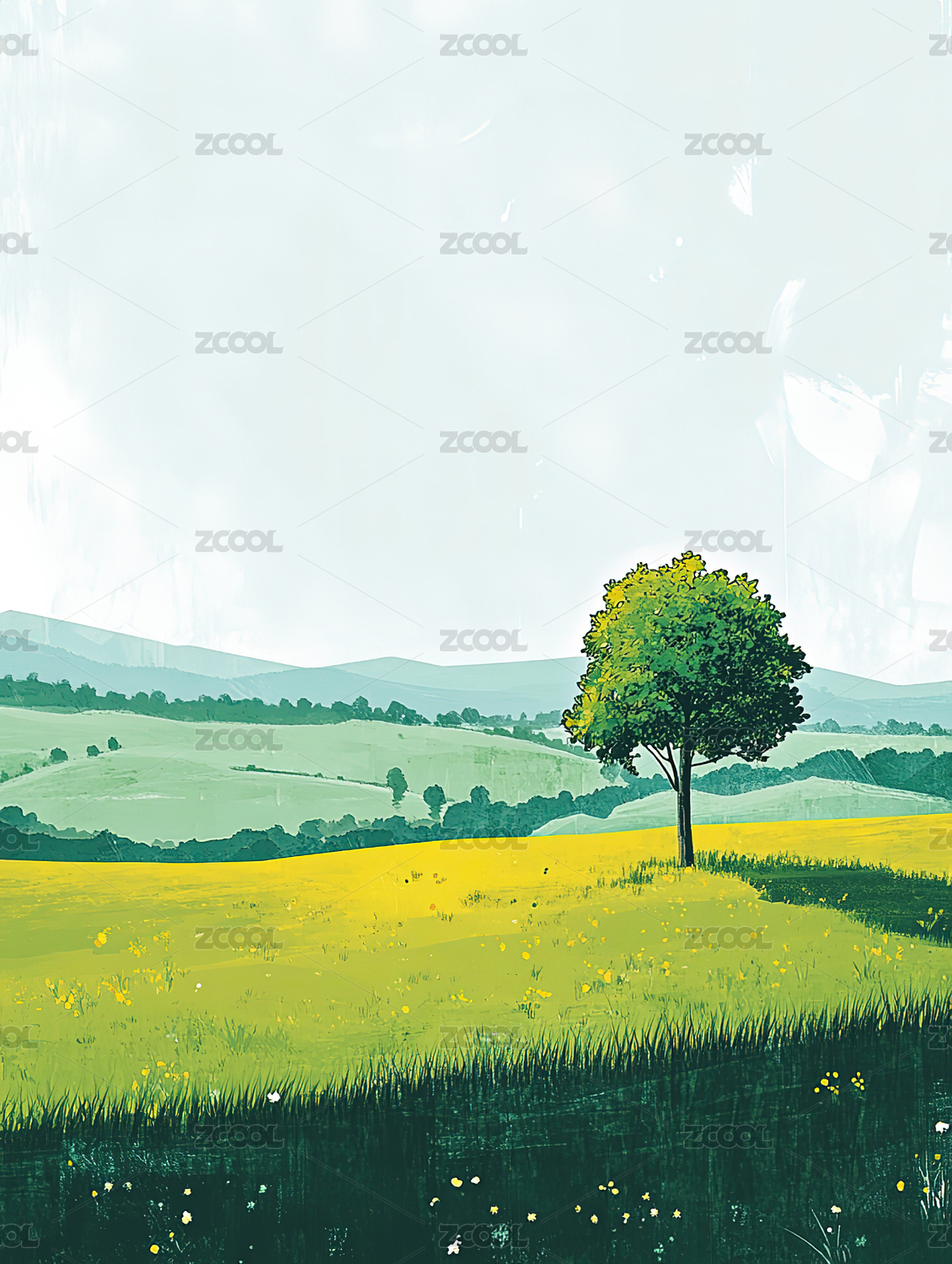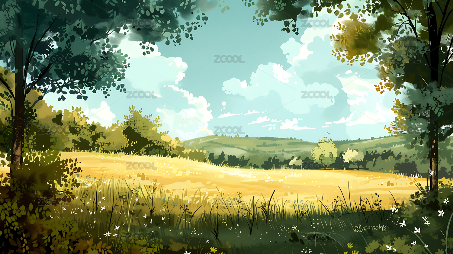 素描,乡村,树木,田野,草地,天空,云朵,远景,近景,构图