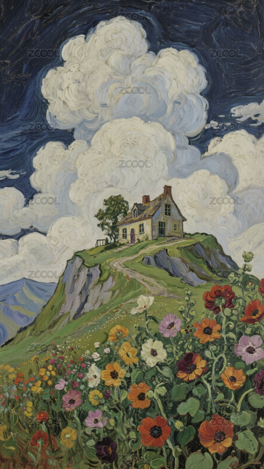 麦田,田野小屋,粉色,抽象画,蓝天,白云,阳光,温柔,几何,水彩