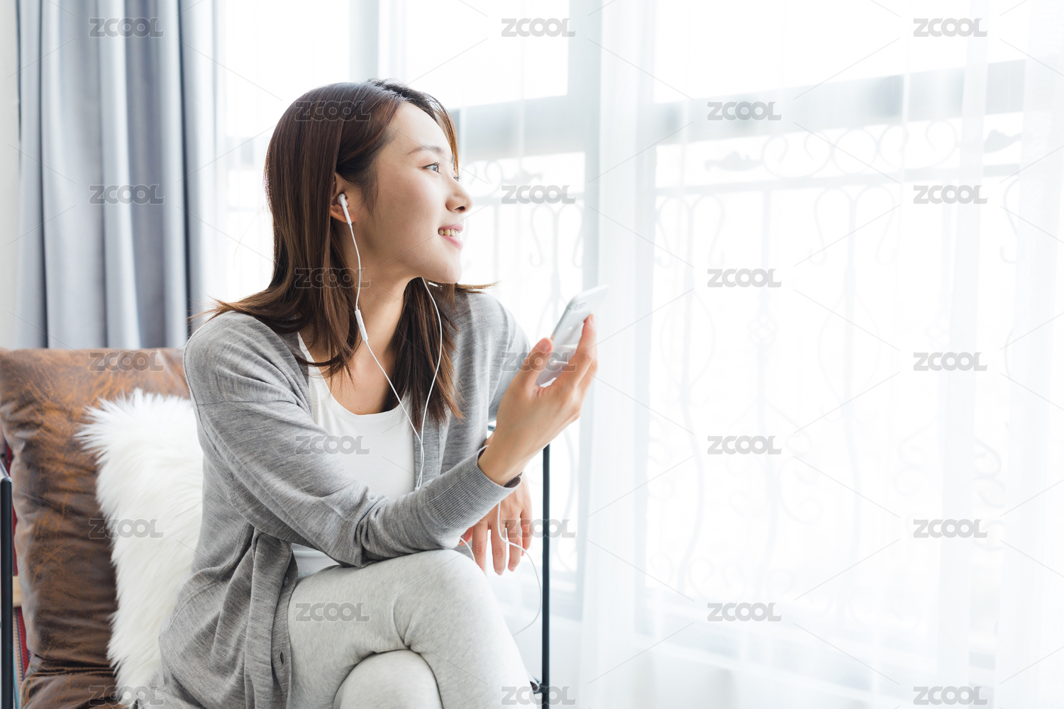 年轻女性在家烤着沙发使用手机听音乐看着窗外