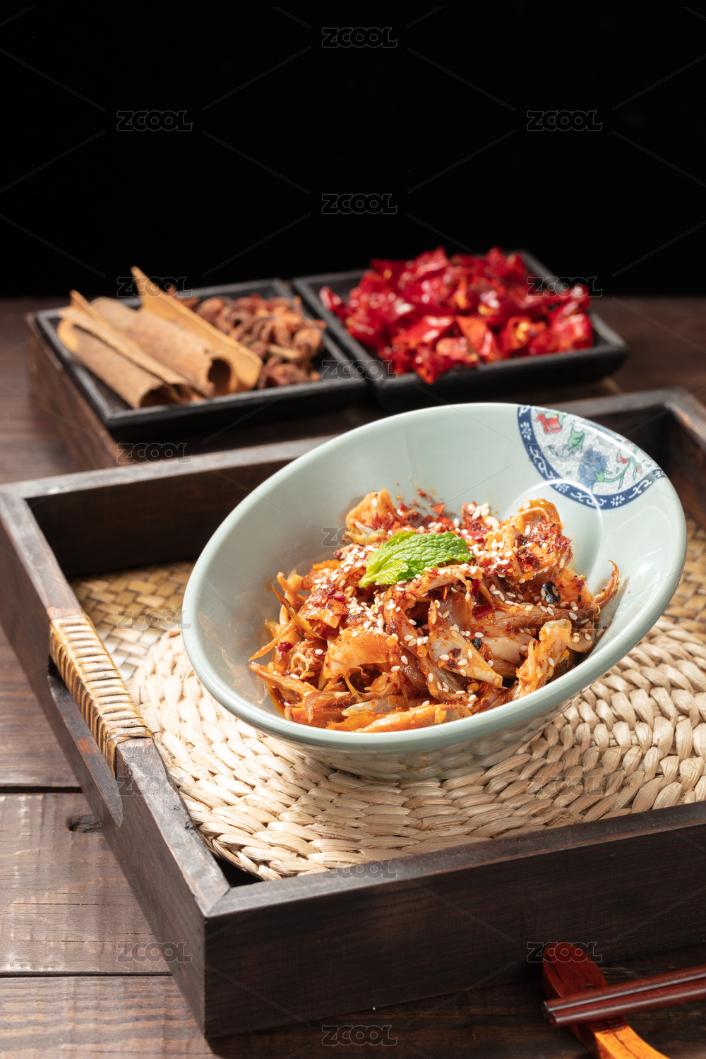 木盒上草垫上碗里的麻辣手撕鸡肉
