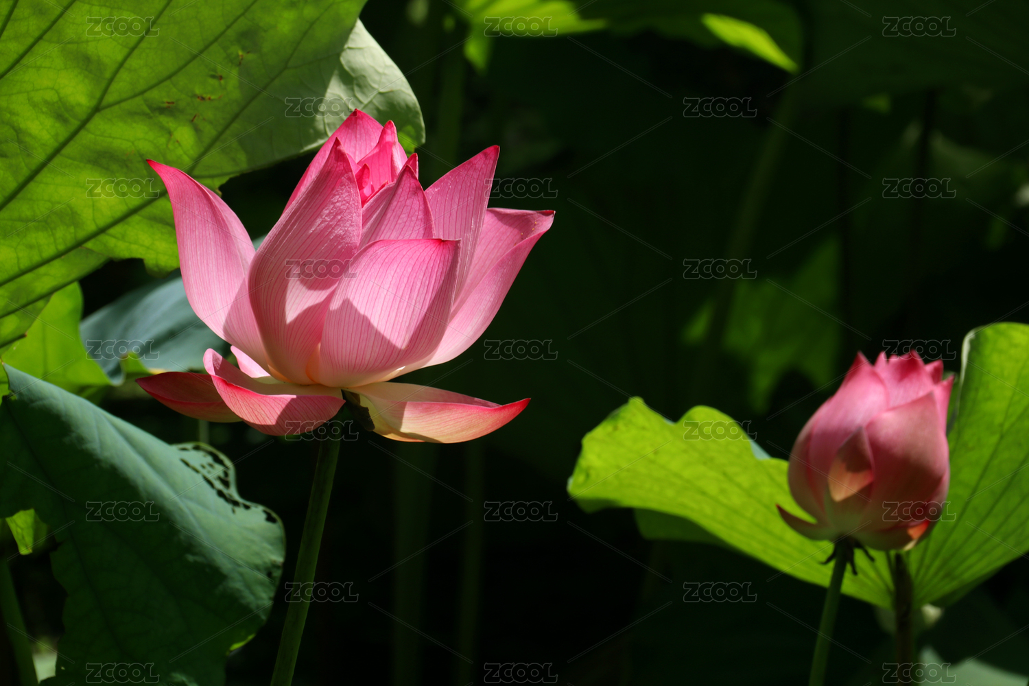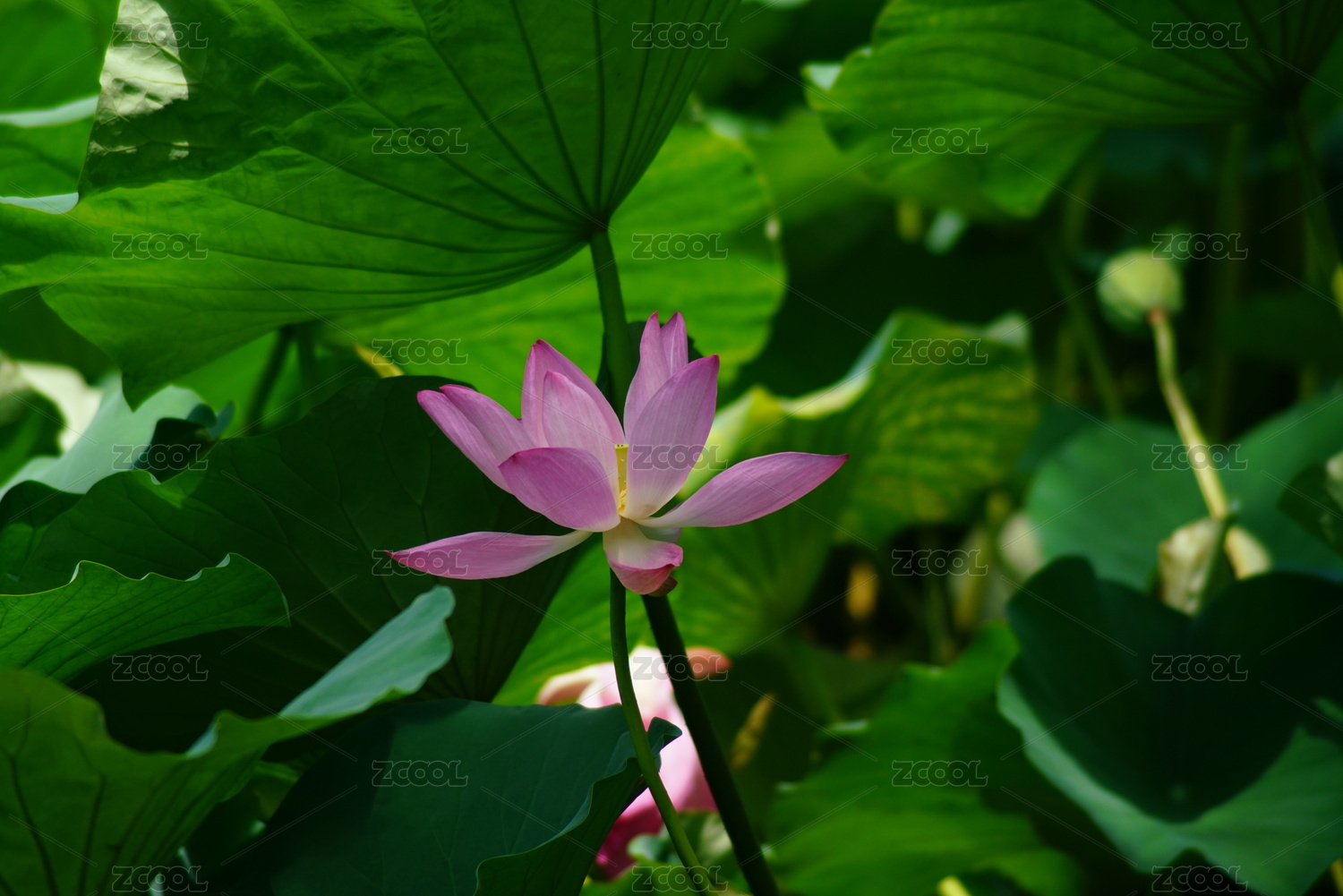 阳光下荷叶围绕中的花苞及绽放的粉荷