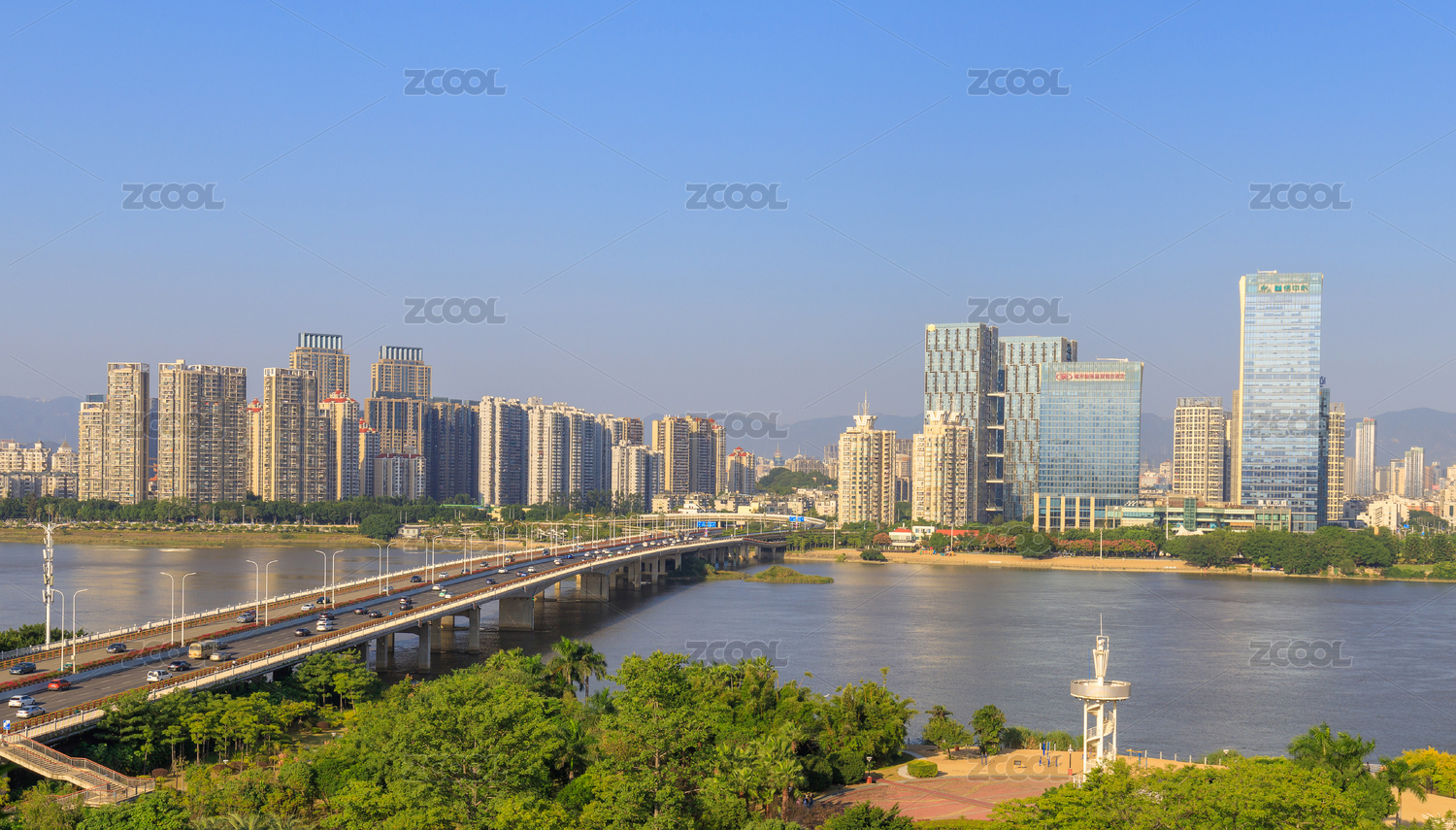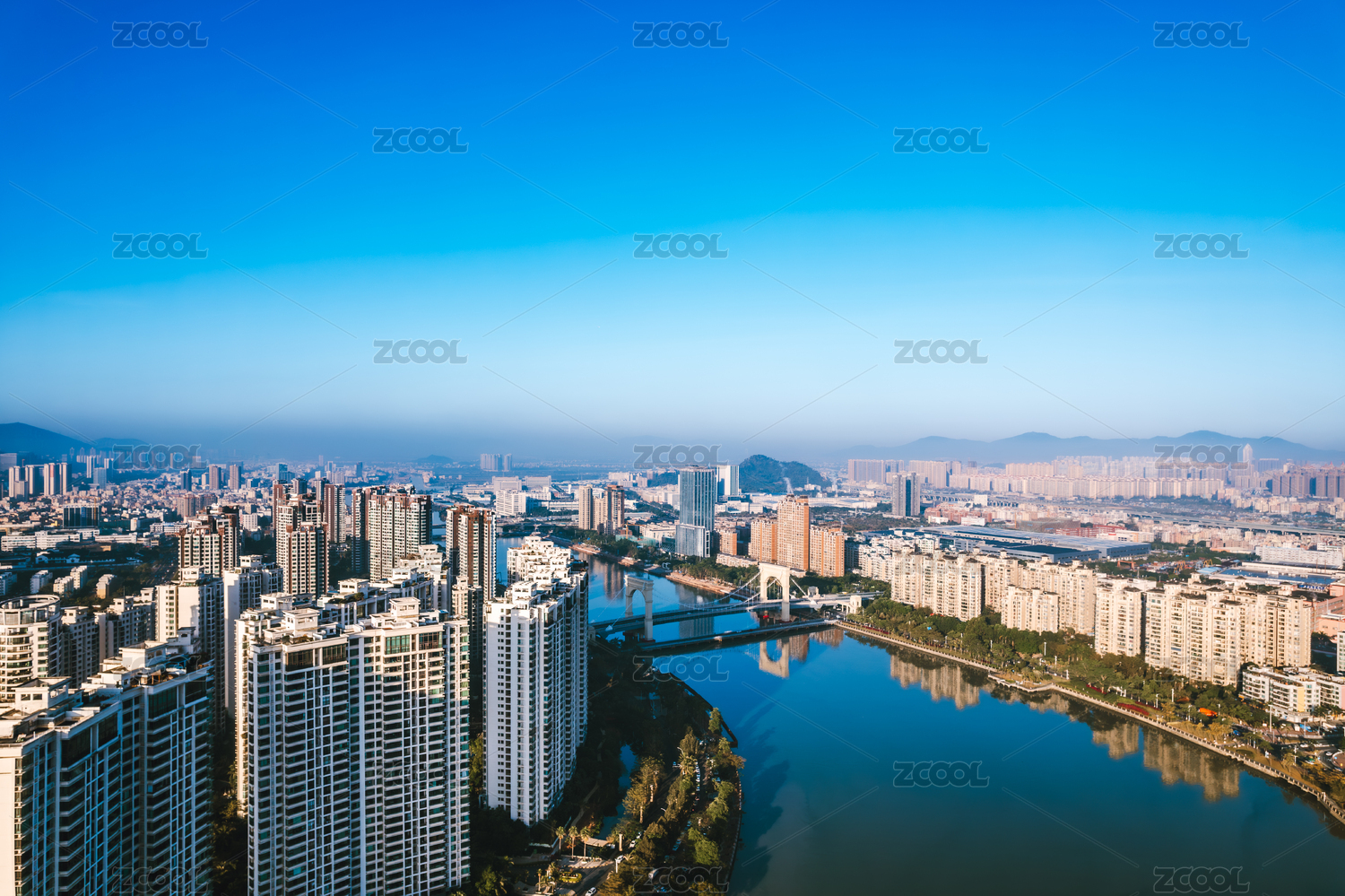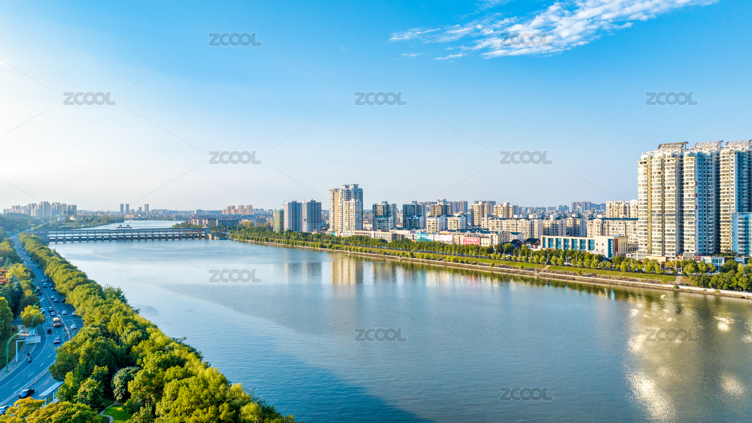 中国浙江杭州钱江沿岸城市建筑高视角风光