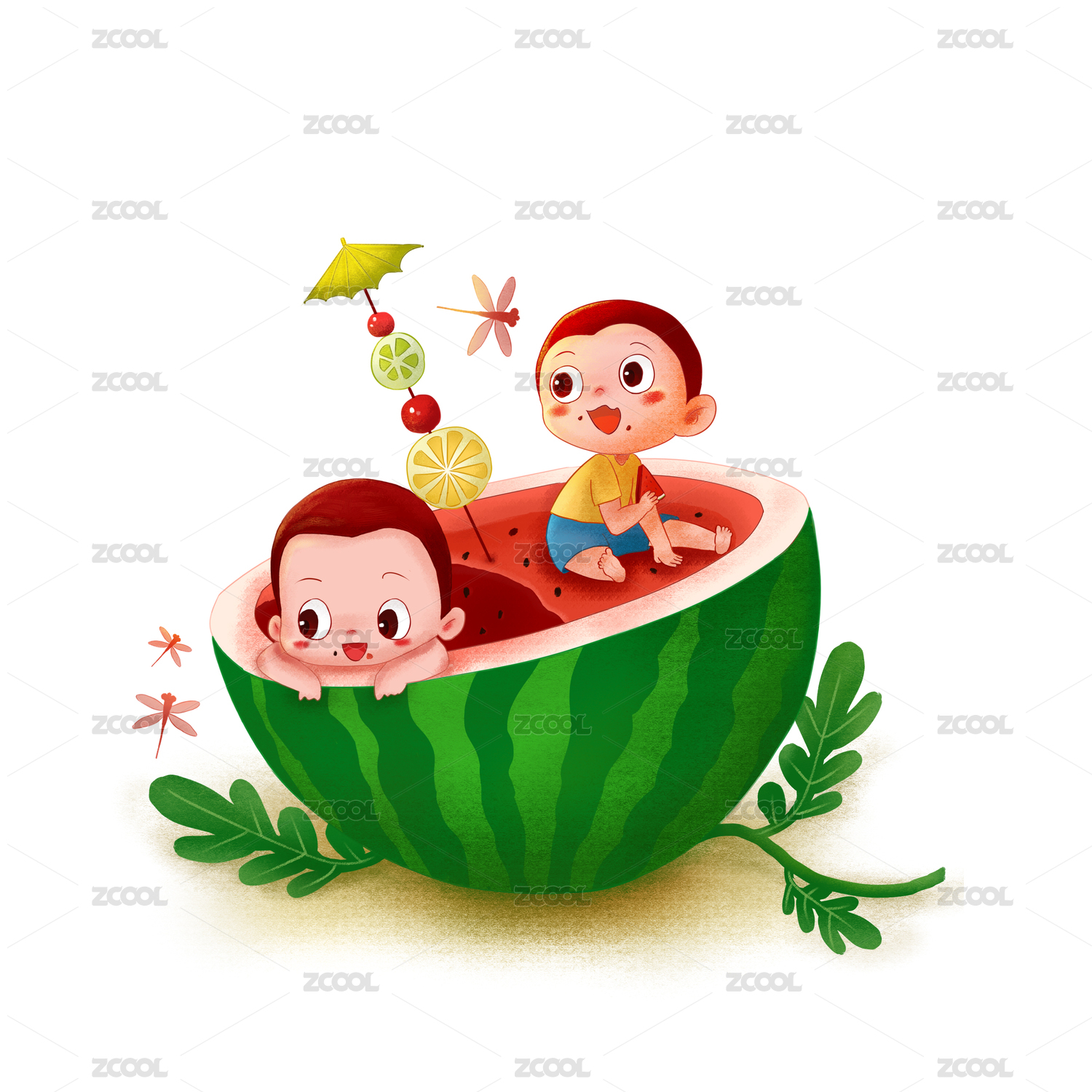 小男孩在西瓜盆中吃着西瓜看蜻蜓凉爽度夏