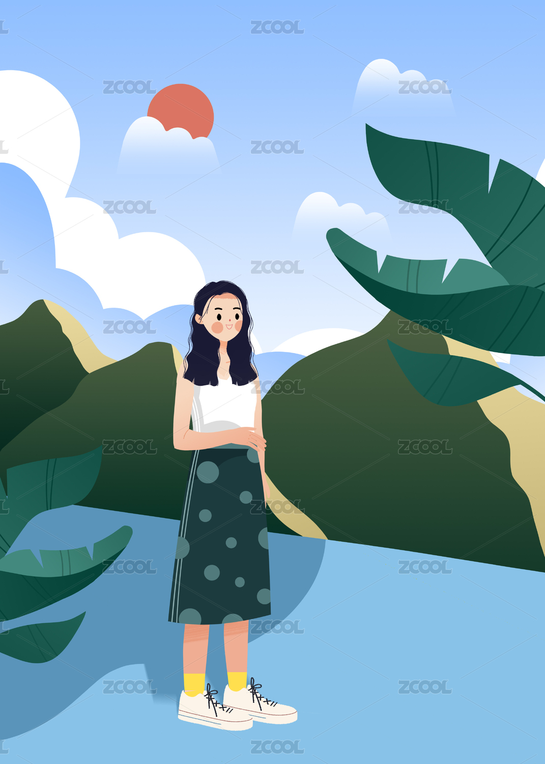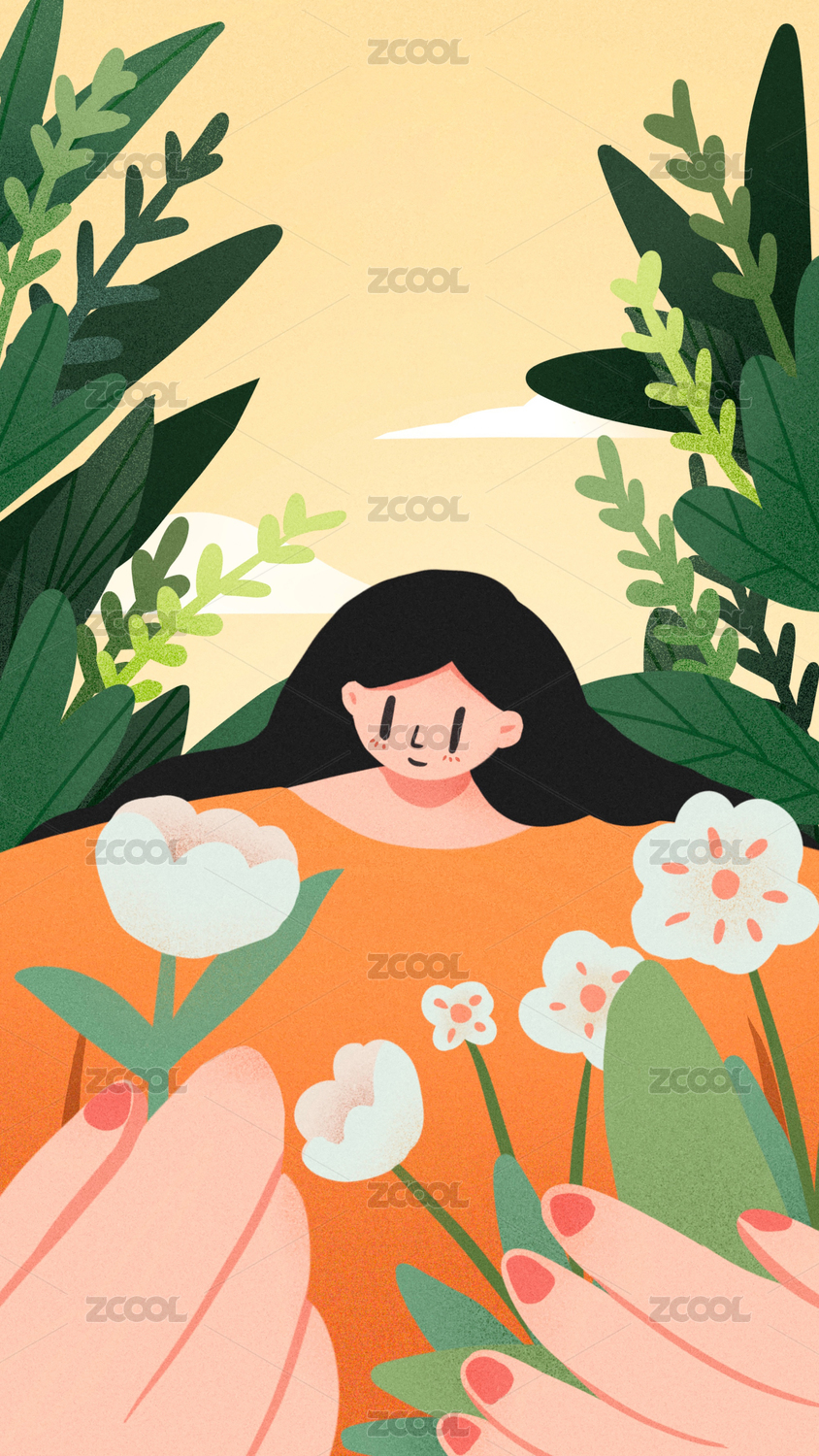 女孩植物花朵扁平化彩色插画