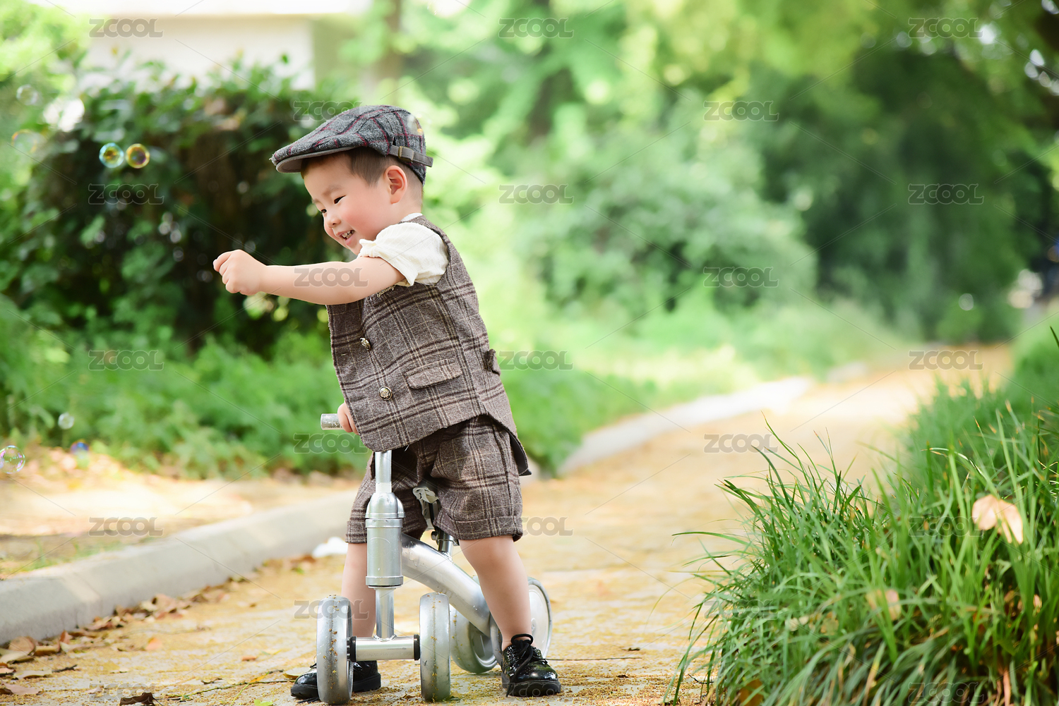 阳光下林荫小路上穿着短袖西服扶着滑滑车抓泡泡的小男孩