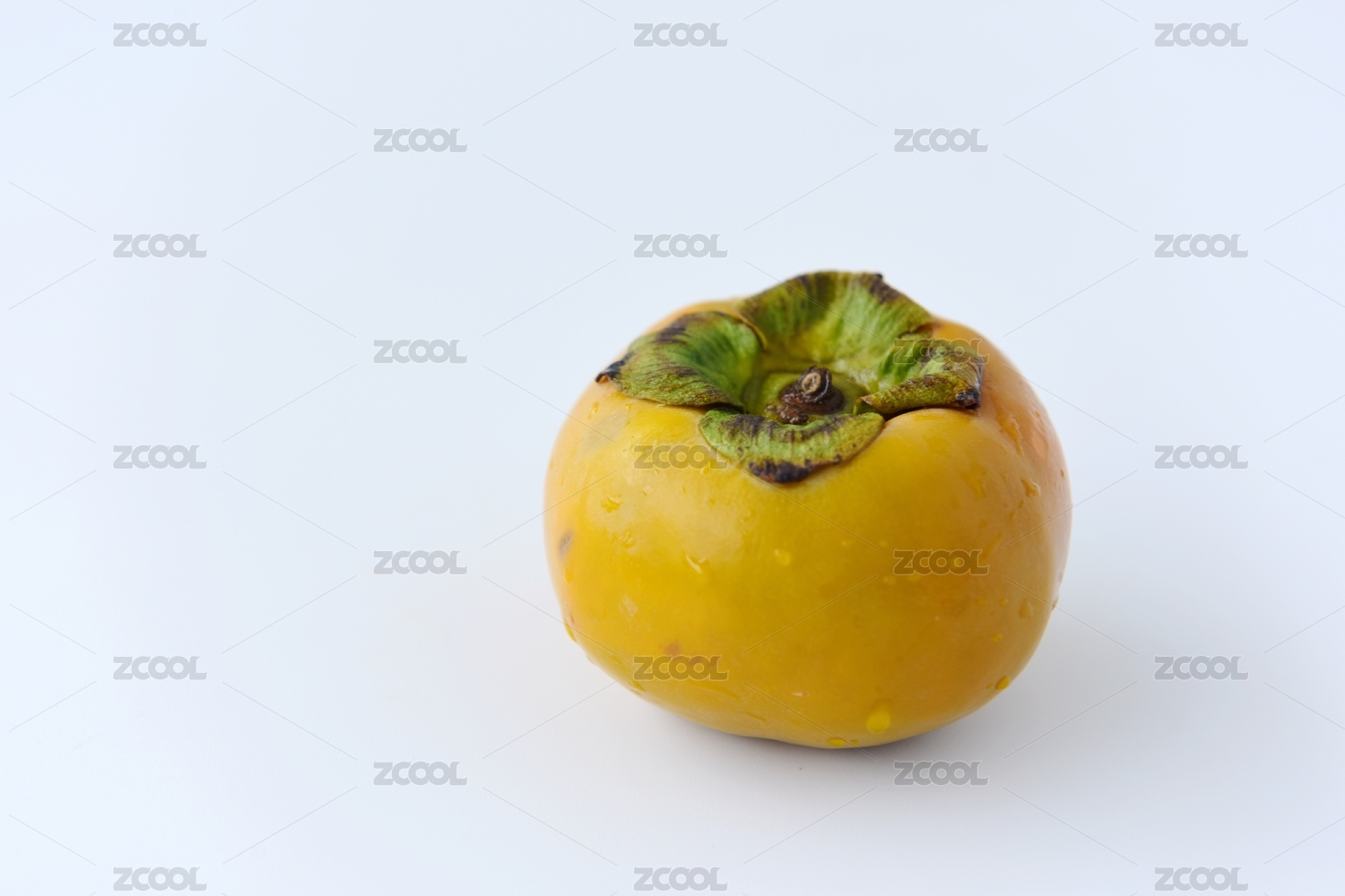 白色背景上摆放着一个新鲜采摘的柿子水果