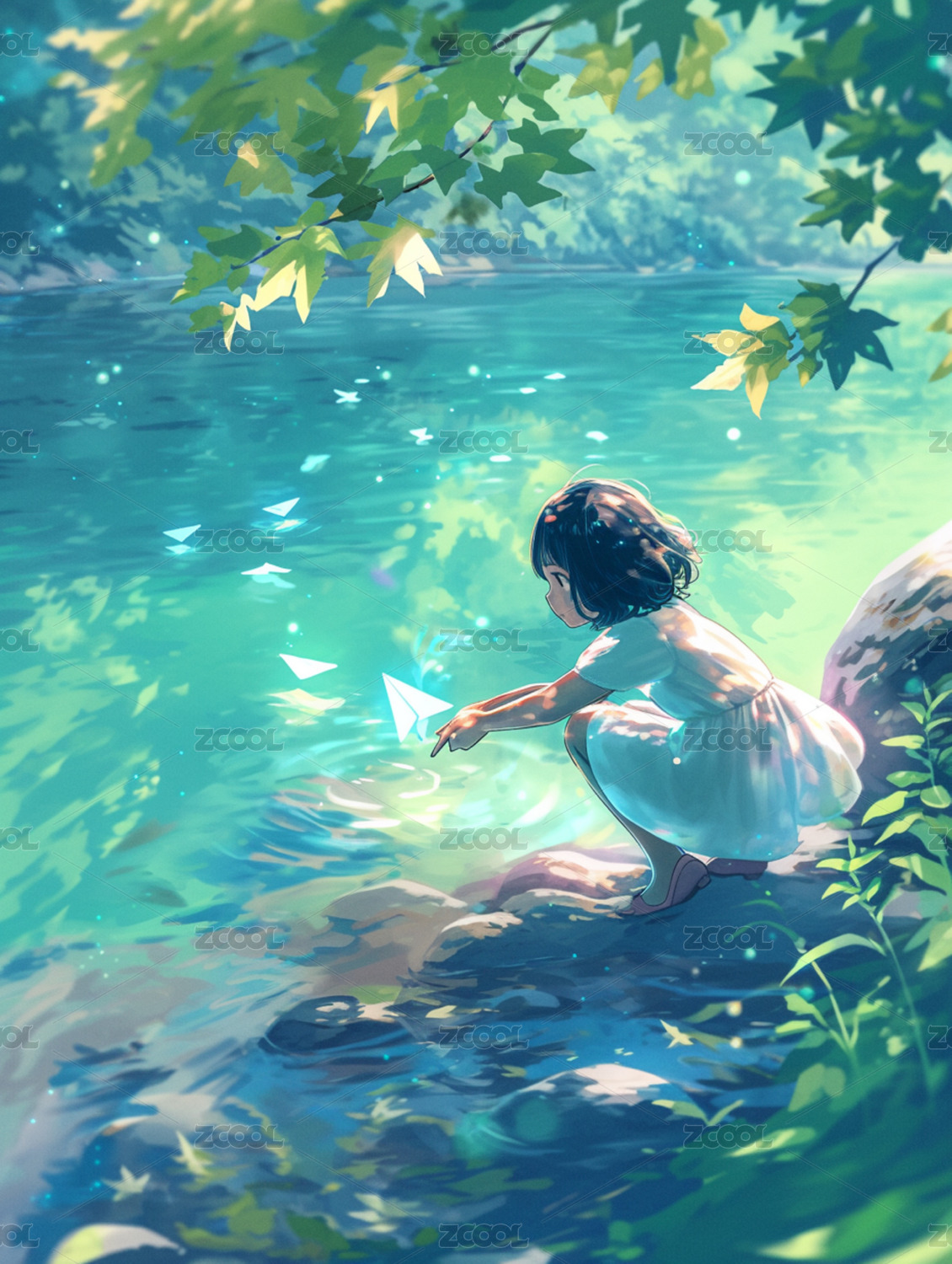 水边阅读的少女梦幻场景