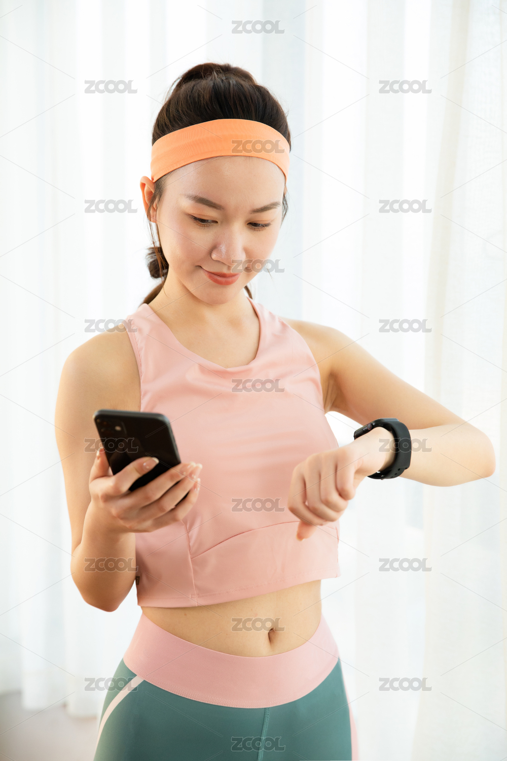 亚洲女子坐在休息跑步机上使用智能手机和智能手表。室内健身房背景。健康运动理念