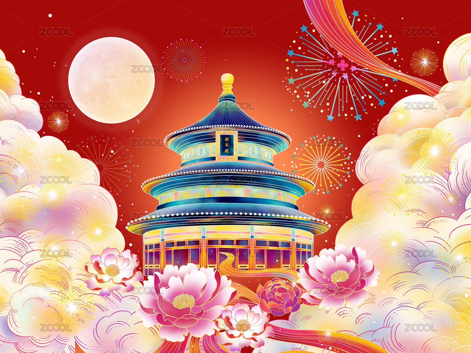 中秋节天坛祈年殿桃花盛开国潮插画海报背景