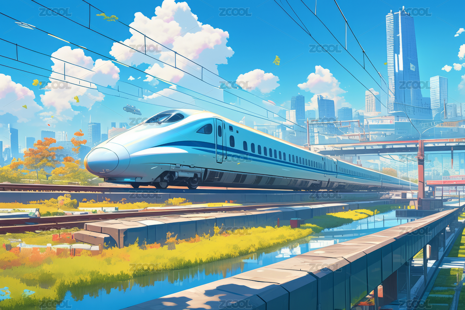 列车,高铁,火车,蓝色,卡通,城市,无人,迅速,高速列车,AI数字艺术