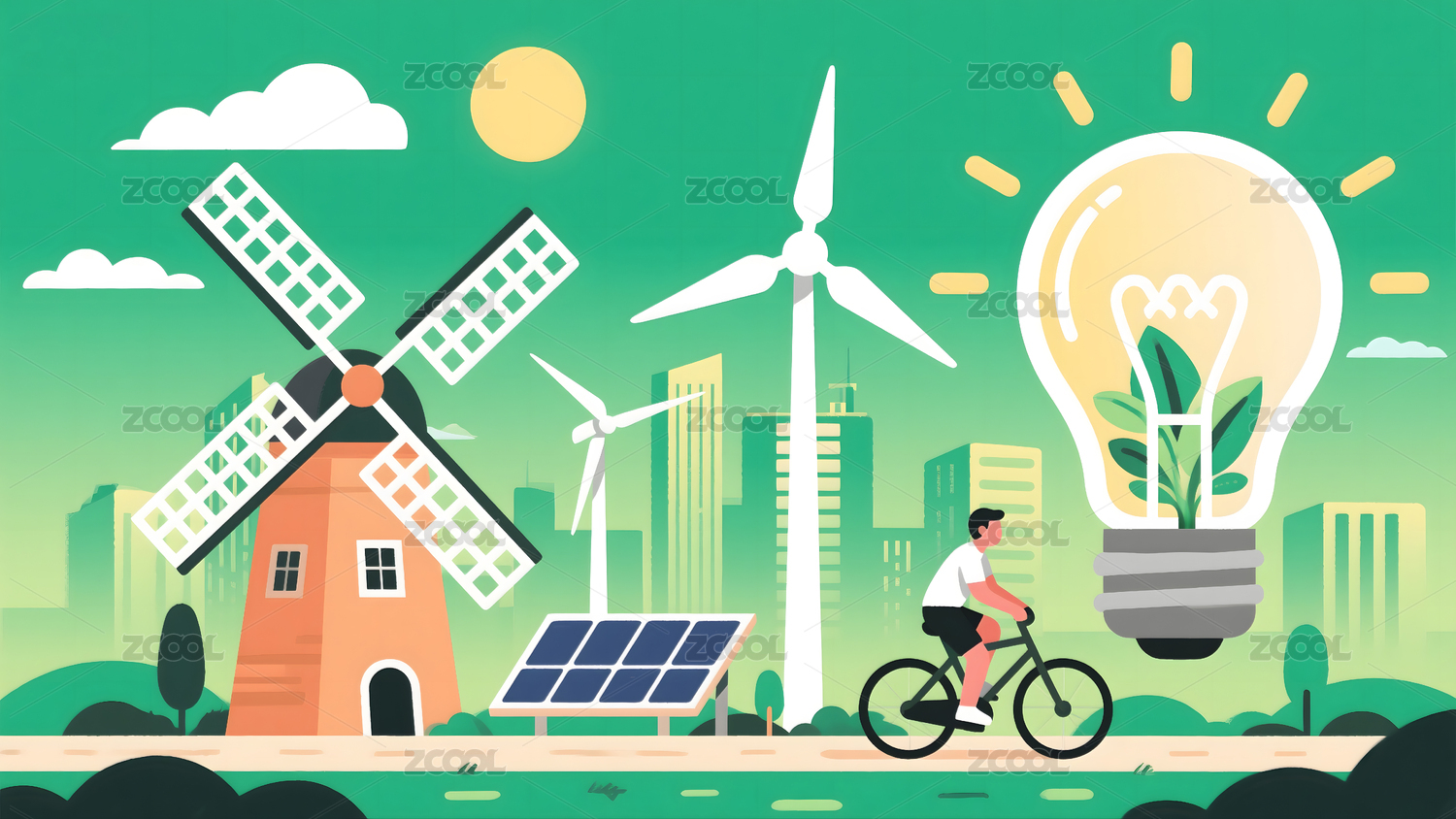 环保插画,新能源,风能太阳能电能,绿色可