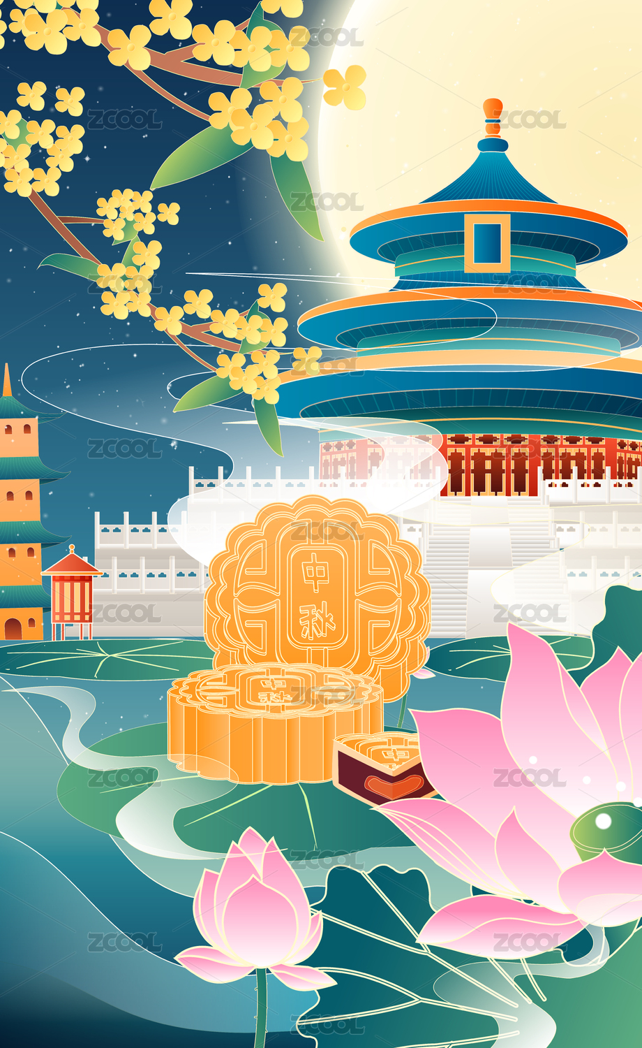 中秋节团圆赏月吃螃蟹月饼秋天美食国潮插画