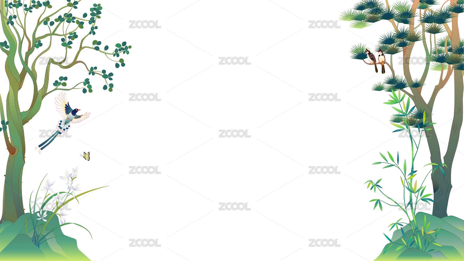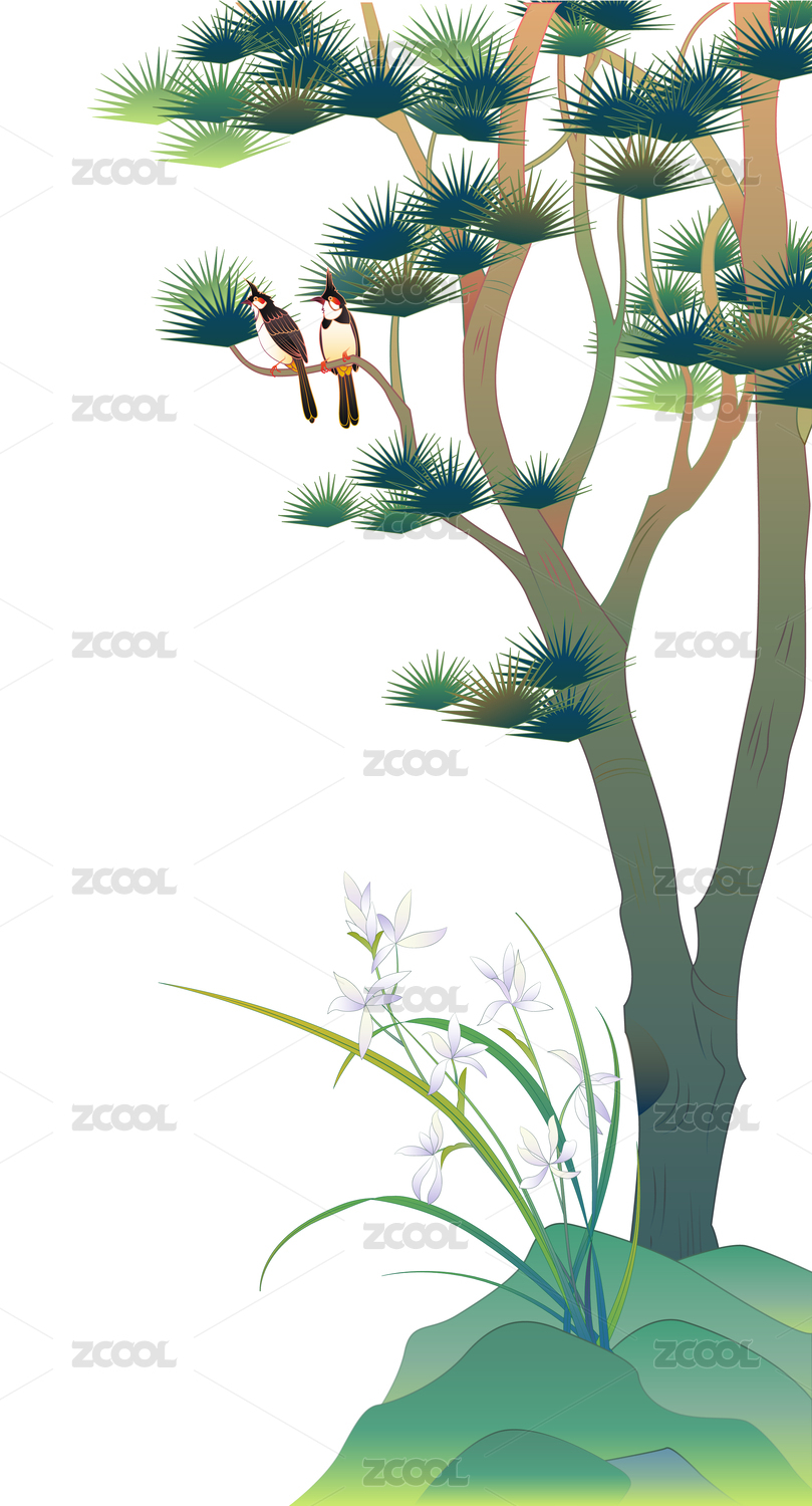 松树菩提树石头竹子兰花国风元素插画