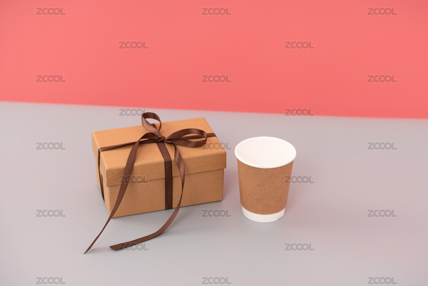 灰色背景上的礼盒与咖啡,节日礼物概念