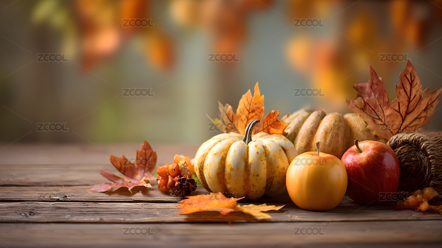 木桌上的南瓜苹果与秋叶