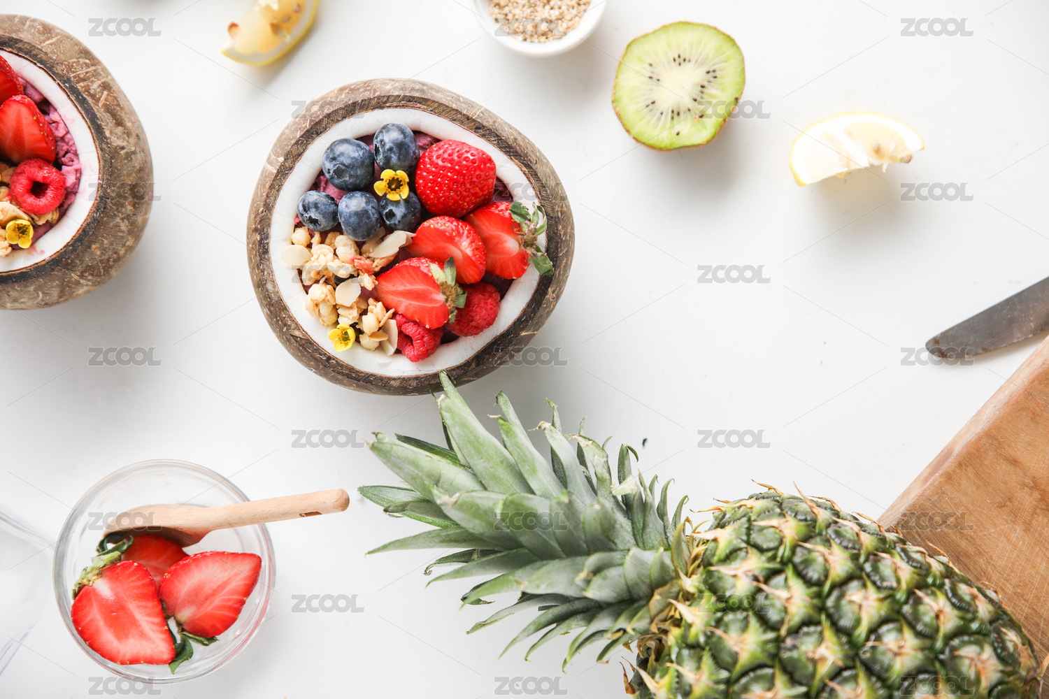 两个椰子承装的草莓蓝莓水果酸奶沙拉