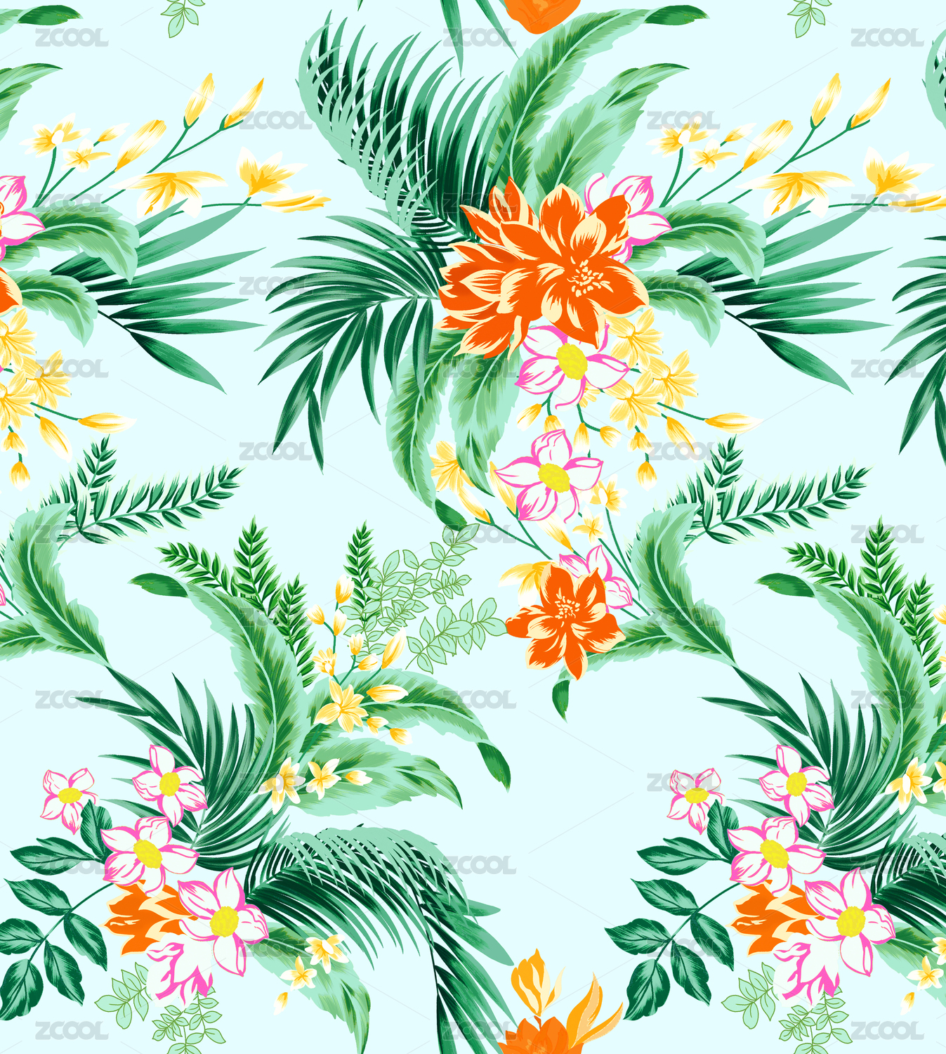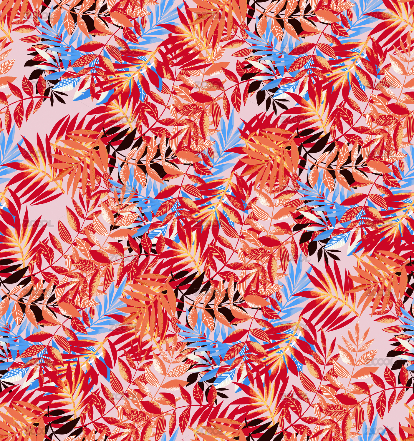 红色背景热带花卉图案。郁郁葱葱的叶子花卉
