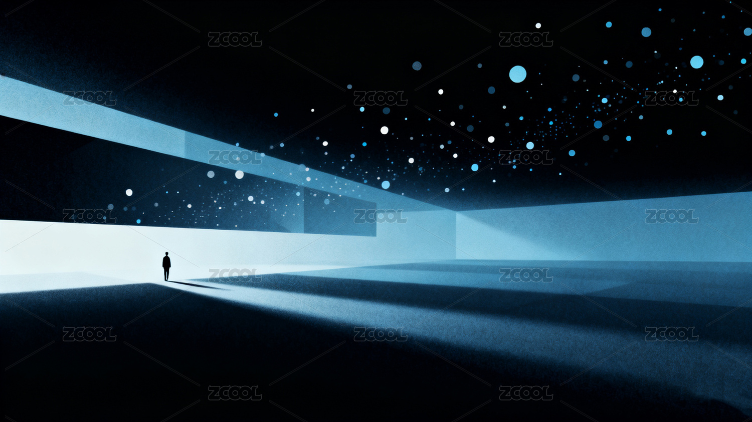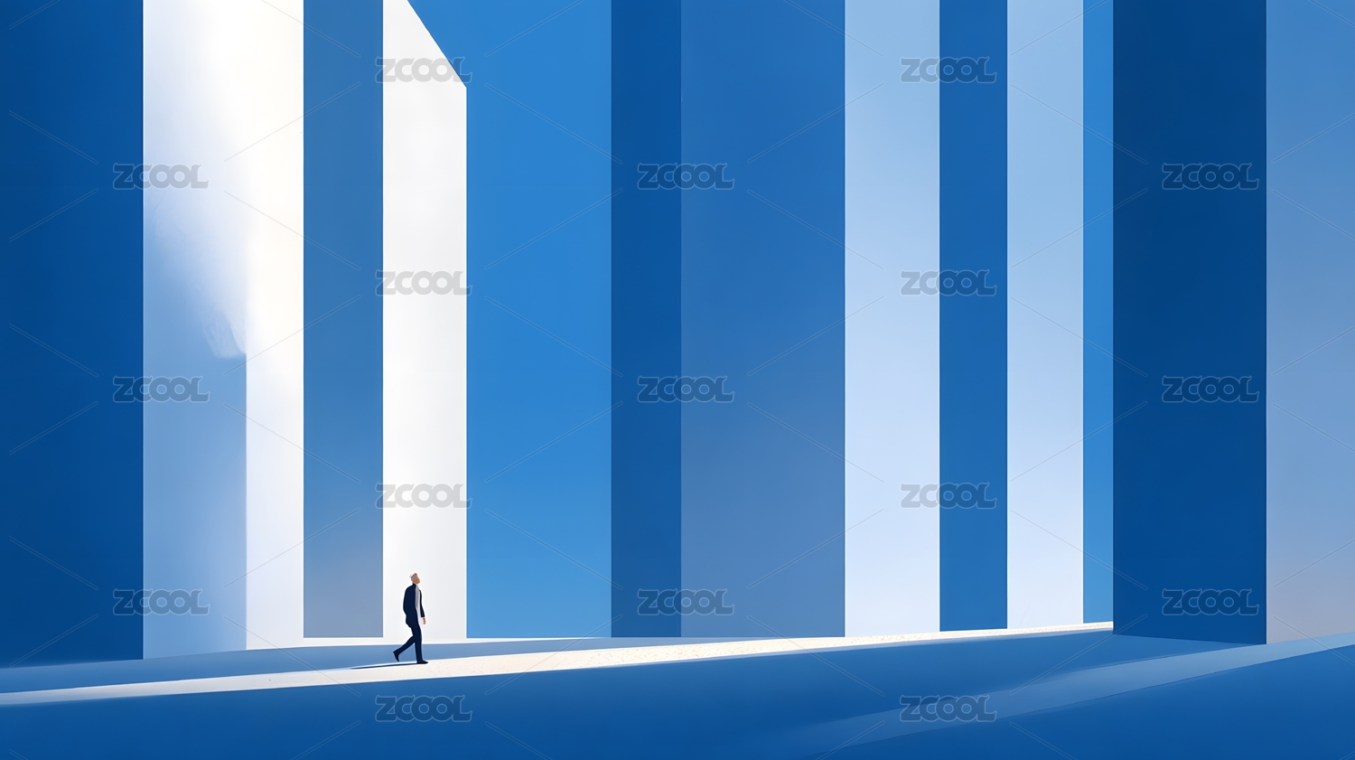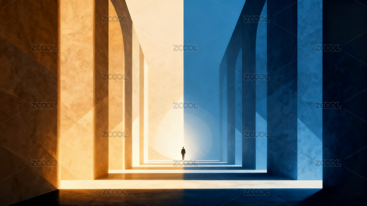 人影立几何空间朝向亮光呈现极简抽象艺术氛