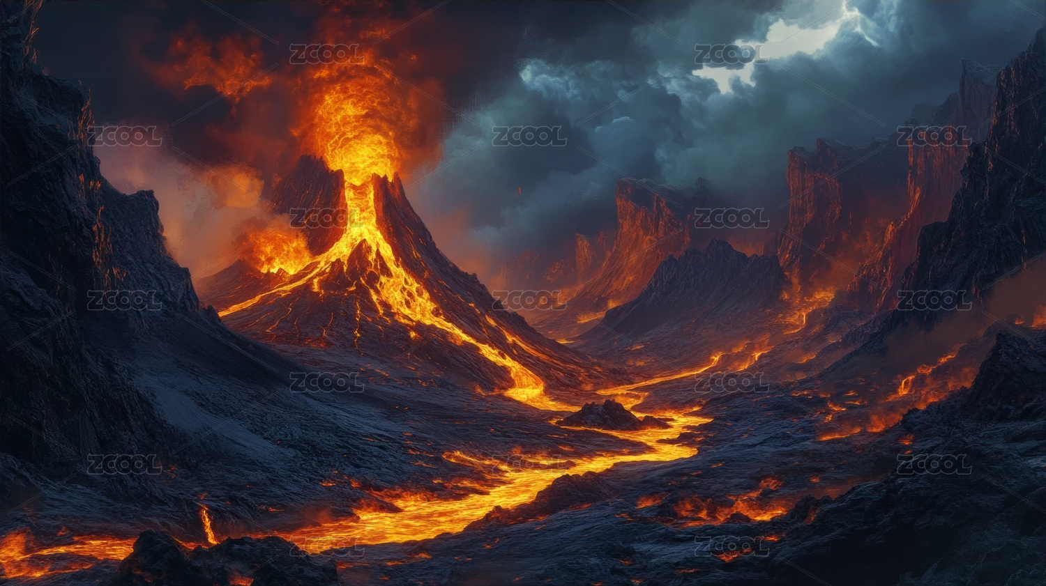 岛屿火山熔浆喷发冰雪流动奇幻超现实大场景