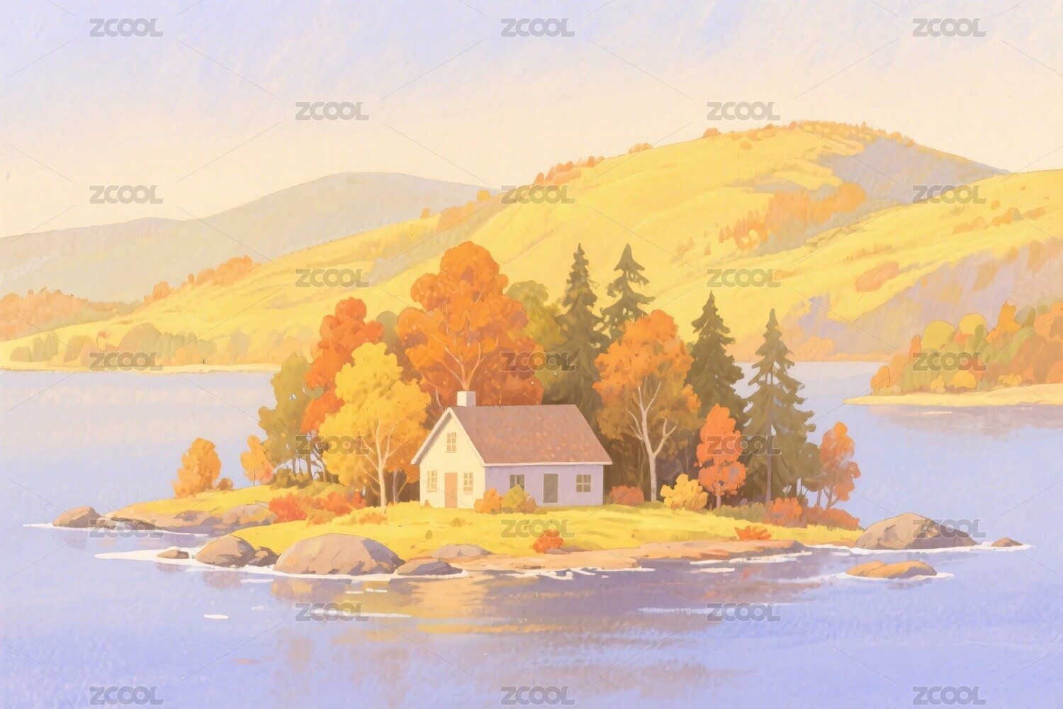 秋日湖畔小屋风景插画
