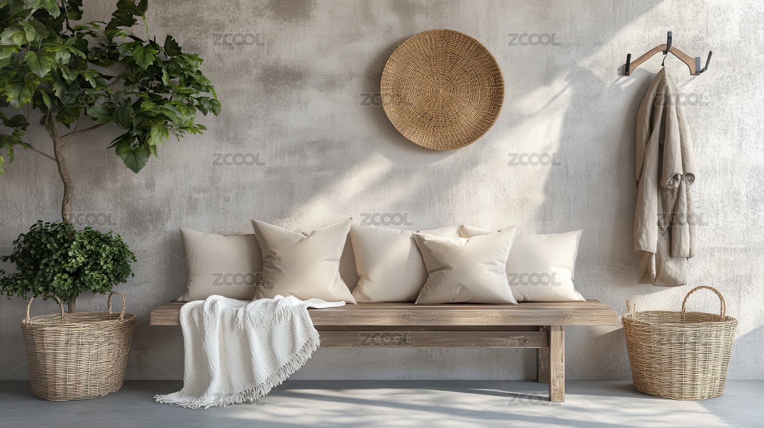 木质长凳,室内设计,简约风格,家居装饰,阳光,壁挂, 宁静, 简洁,舒适,温馨