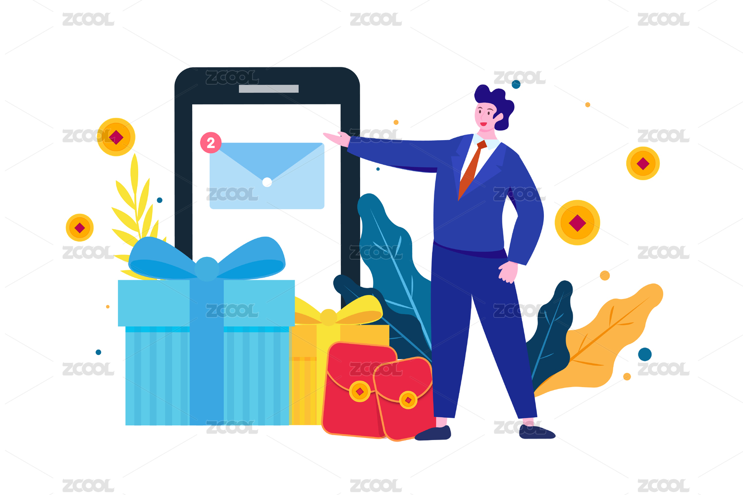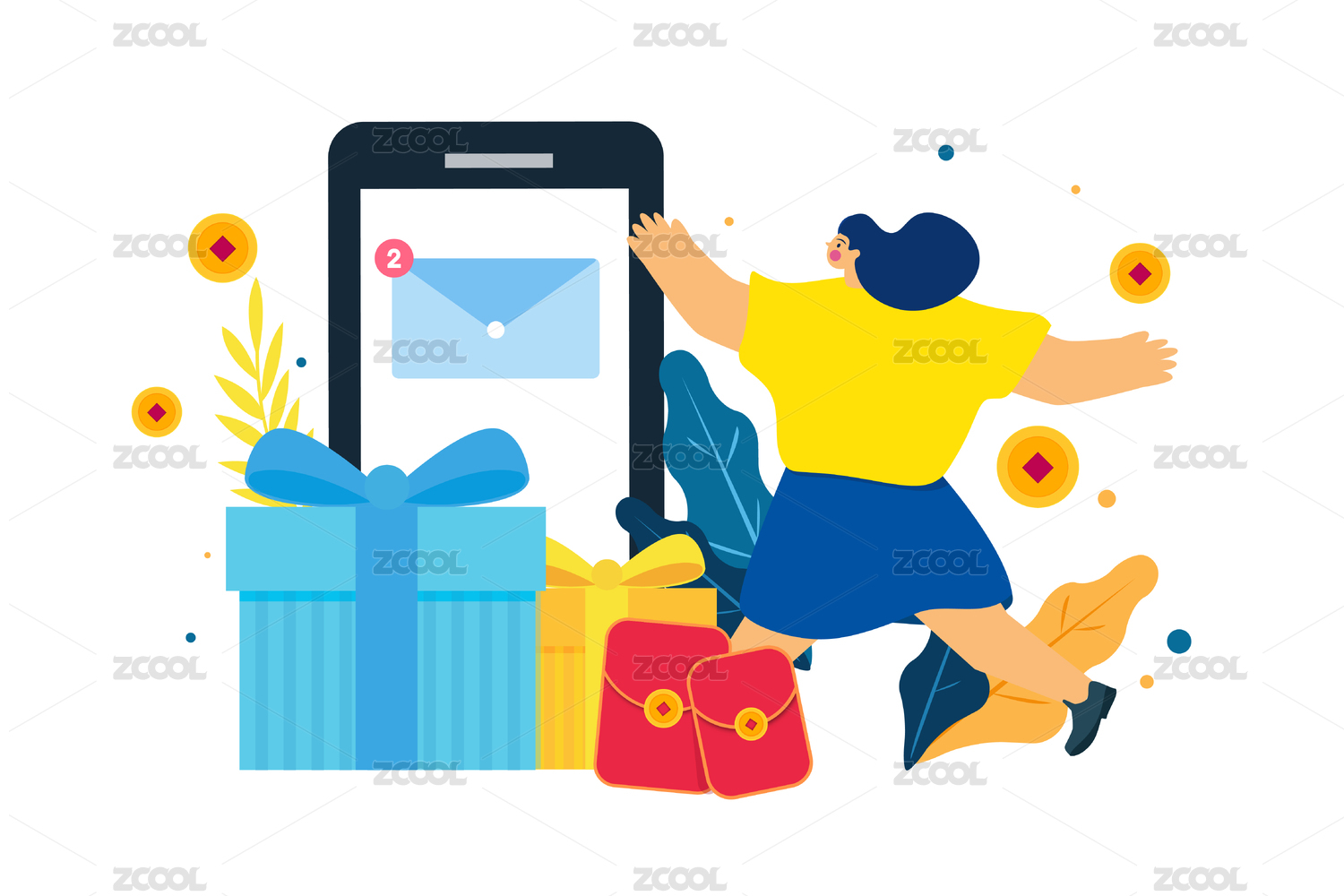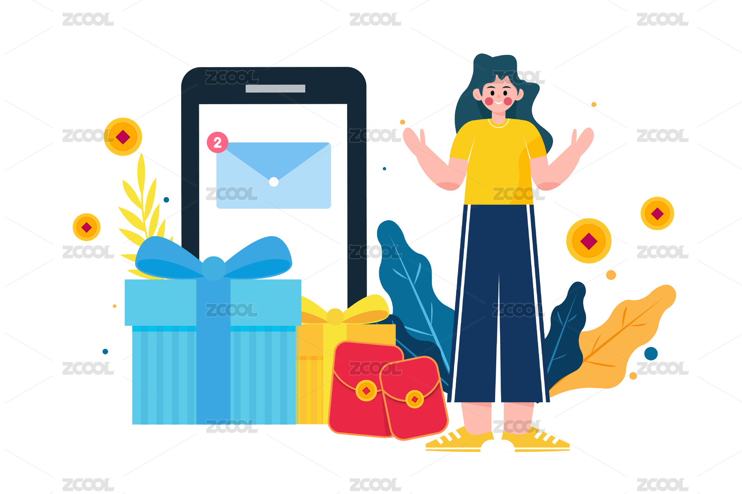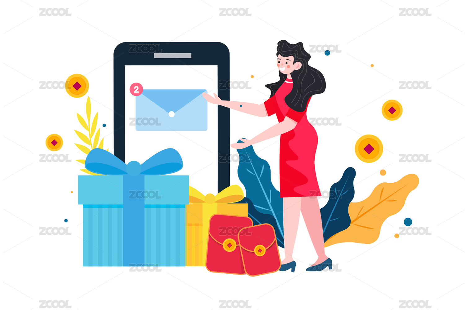 使用手机邀请好友的男女领取红包,扁平矢量人物场景创意概念插画