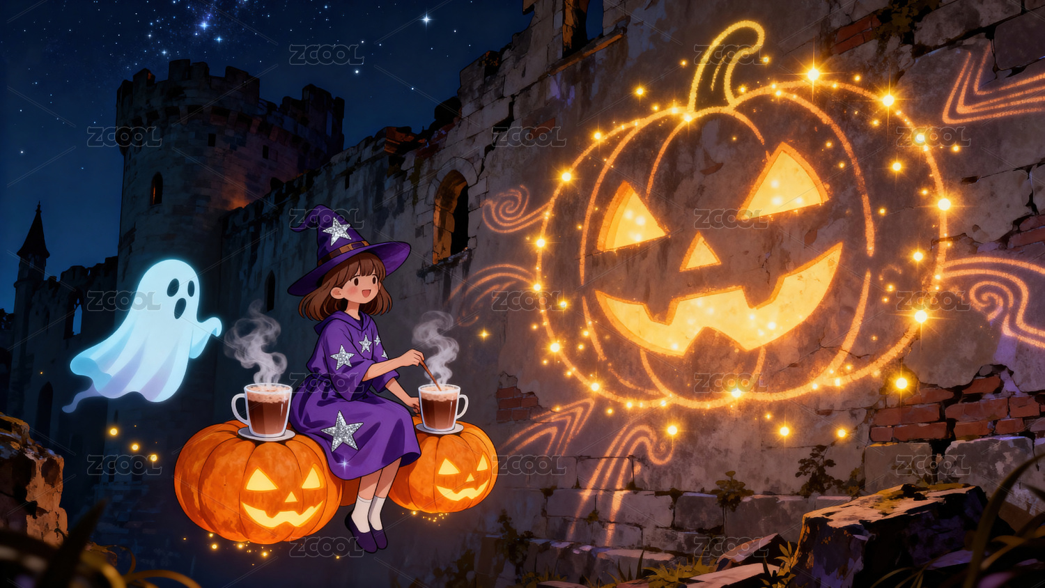 万圣节一个可爱Q版棉花女娃娃坐在南瓜灯上