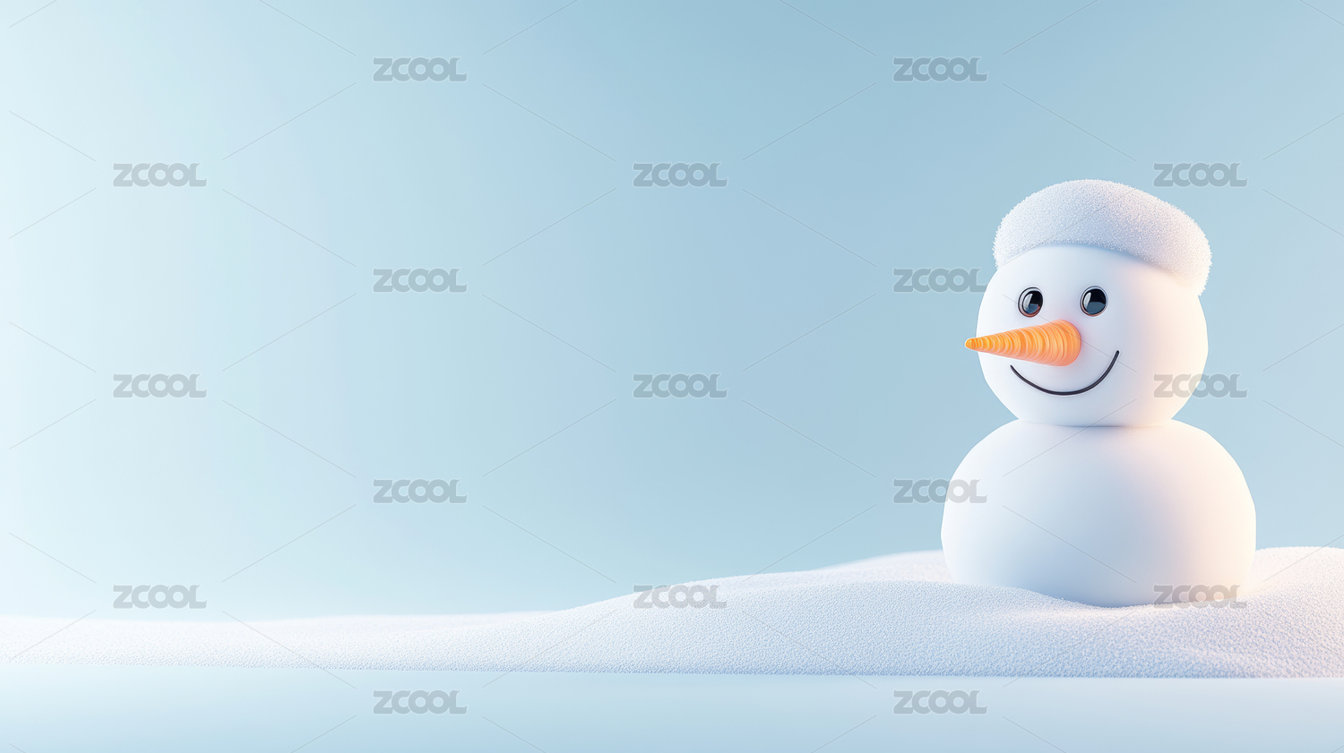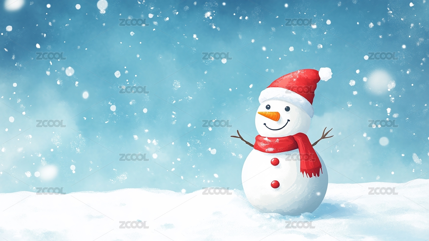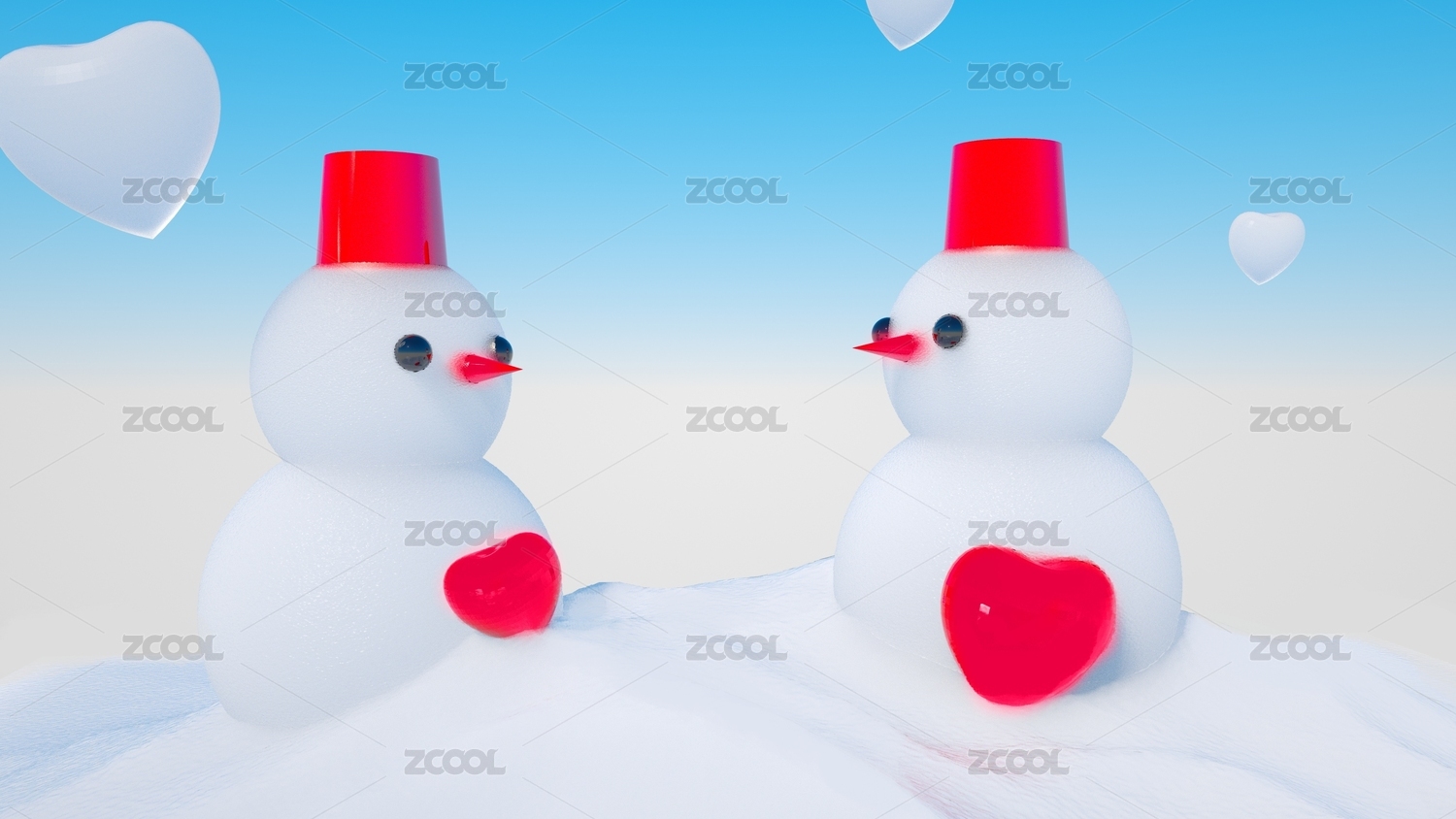 蓝色天空与白色雪地上的红色、白色爱心桃、雪人和文字