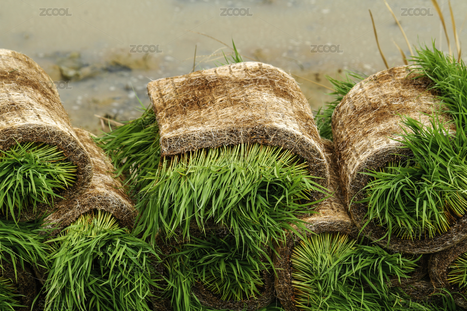 农田里捆绑的水稻秧苗
