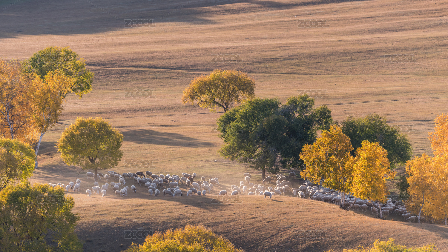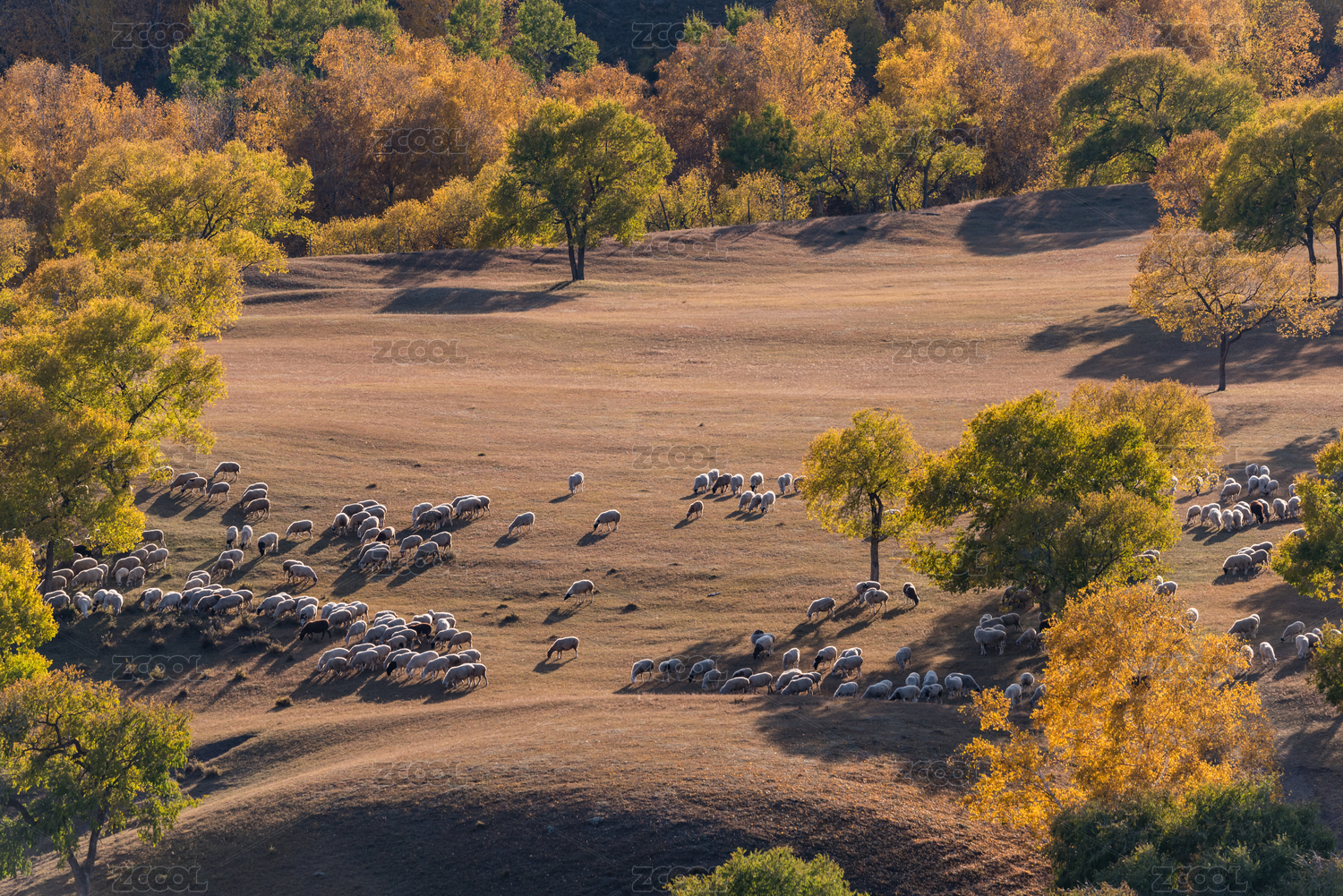 秋天内蒙古赤峰的山坡草原树林和羊群