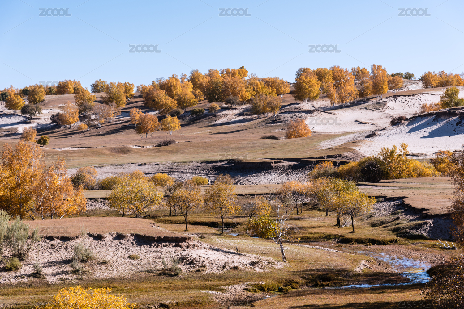 秋天内蒙古乌兰布统坝上草原的沙地和白桦林
