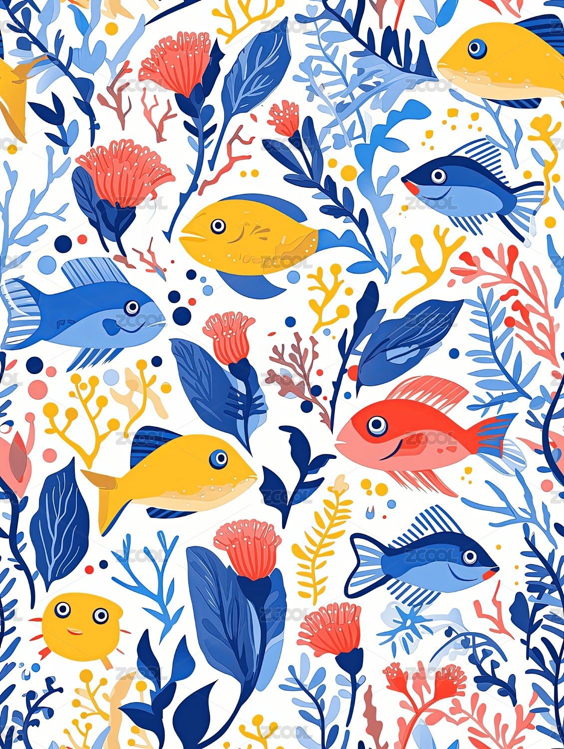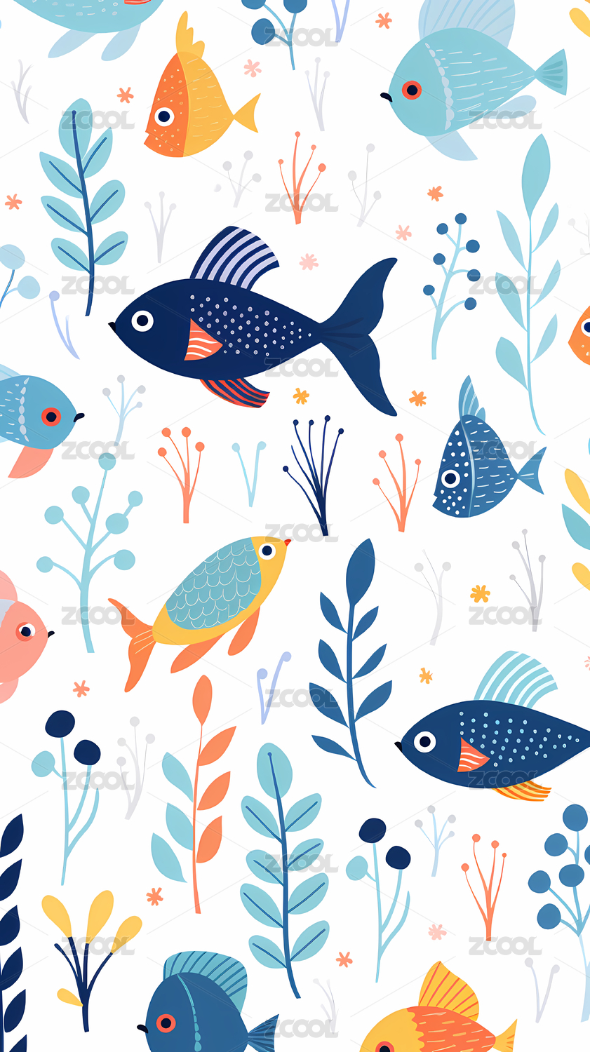 海草和鱼卡通插画无缝图