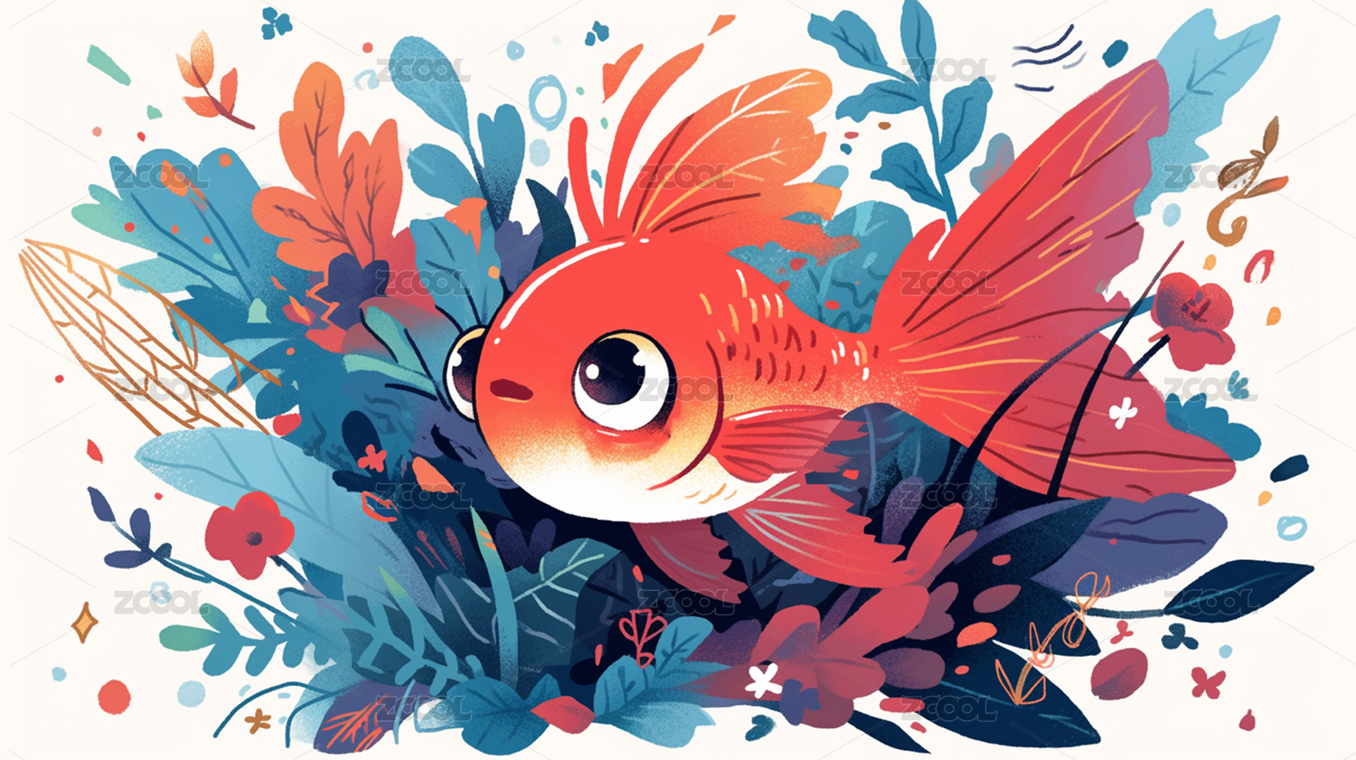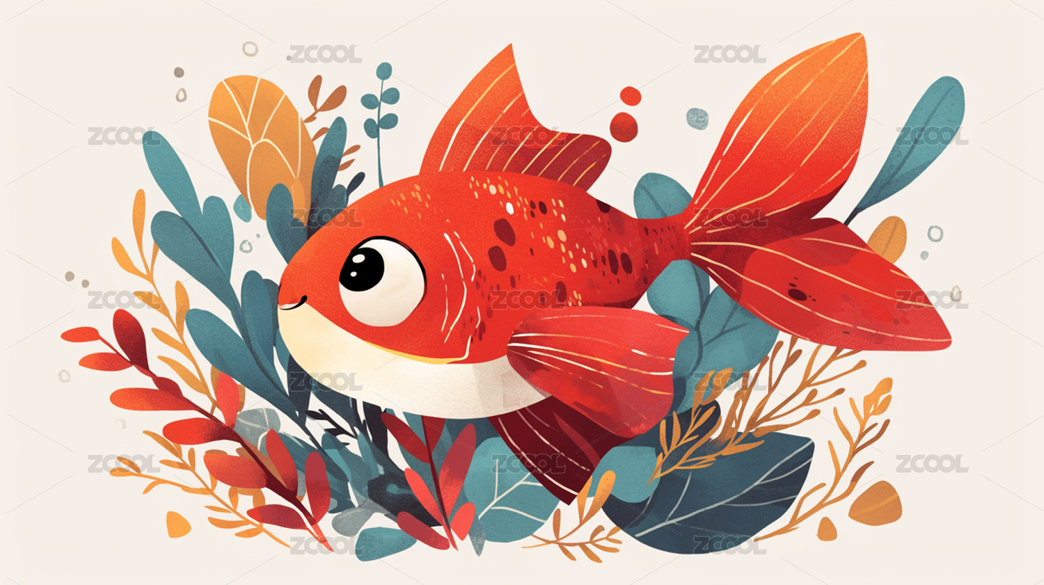 在水草中开心游泳的红色卡通小鱼