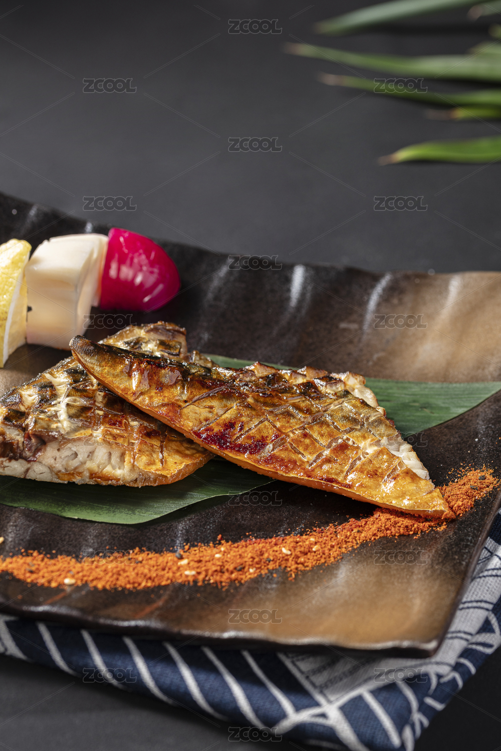 日本料理盘子里的日式烤鱼头烤三文鱼头
